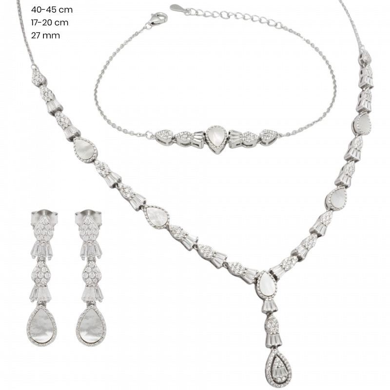 This jewelry set made of 925 Sterling Silver with a rhodium coating is a true masterpiece consisting of three pieces: a necklace, a bracelet, and earrings. The rhodium-plated surface ensures the jewelry's long-lasting shine and resistance to discoloration. The jewelry set has a delicate, classic design that is both elegant and timeless. The necklace has a clean yet unique shape that accentuates the neck, while the matching bracelet and earrings perfectly complement the set. This jewelry set is the perfect choice for special occasions such as elegant dinners, weddings, or balls. The three-piece set allows you to wear the pieces separately, but together they create a truly stunning effect. Thanks to its elegant lines, it goes well with any style.