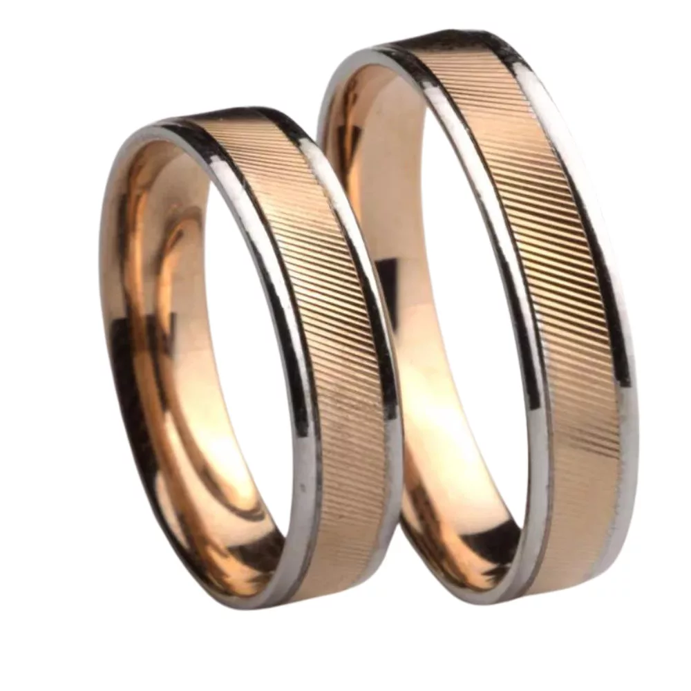The flat-designed wedding band in two colors, namely bicolor white and red gold, made of 14-karat gold. The band of the Miami ring, reminiscent of the glowing red of the scorching Florida summers, is made of white gold, while a carved red gold stripe runs through the center, made unique by its diagonal carving.