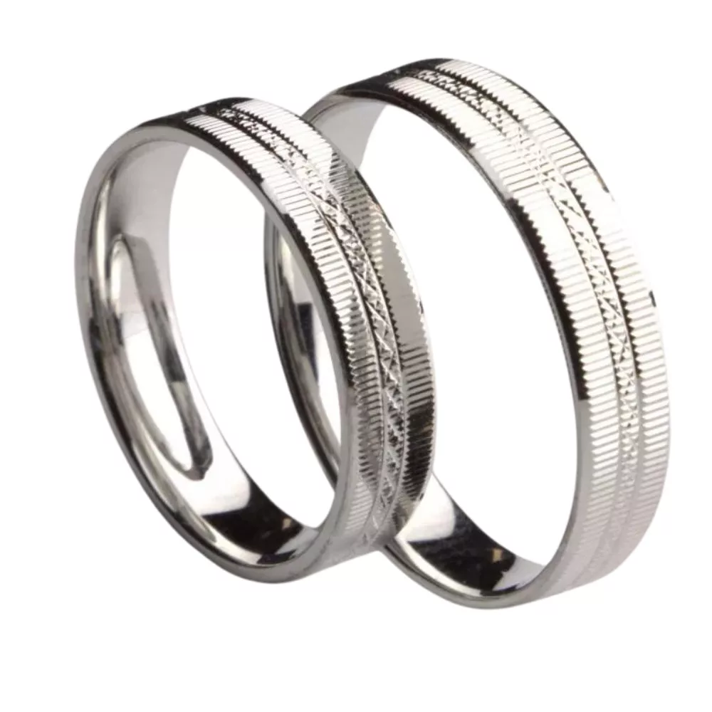 An unusual 14-karat white gold wedding band with double engraving. The ring band consists of three parts, with a thin band decorated with crosswise engraving in the middle and straight engraving on both sides of the wedding band. The multiple engravings beautifully refract the light and make the jewelry irresistible.