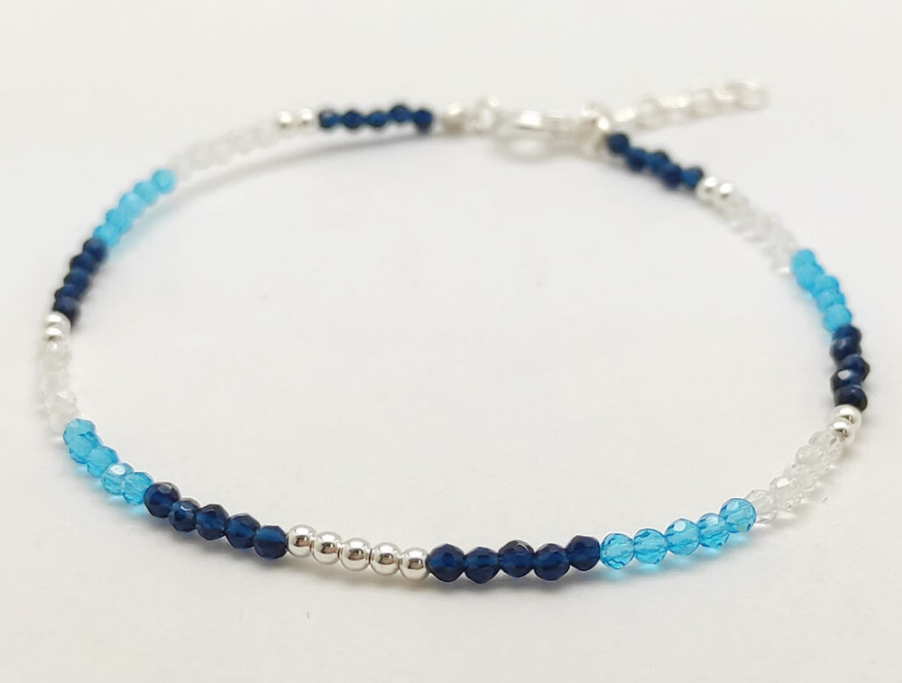 The water-blue aquamarine and transparent rock crystal give this enchanting bracelet a beauty reminiscent of the sea, while the silver spheres make the mineral beads even more spectacular. Wear it to a beach festival or on vacation, either on its own or layered with other mineral bracelets. Adjustable size to fit your wrist perfectly.