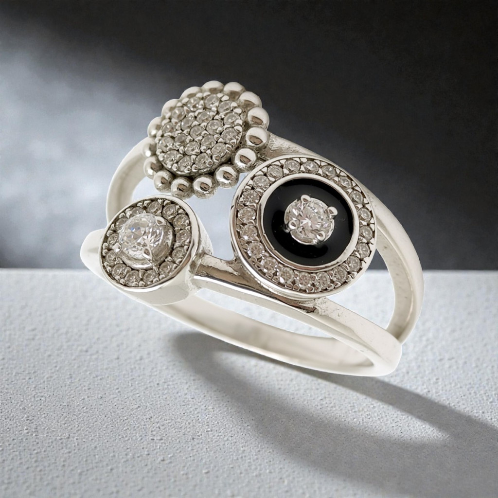This triple band ring is one of the finest pieces of modern elegance. Made of 925 rhodium-plated silver, the ring consists of two intersecting curved lines, made even more special by sparkling zirconia stones. The shiny stones gently reflect the light, making the ring sparkle harmoniously with every movement.