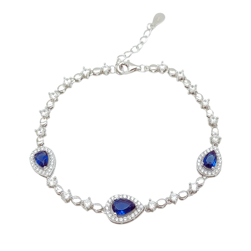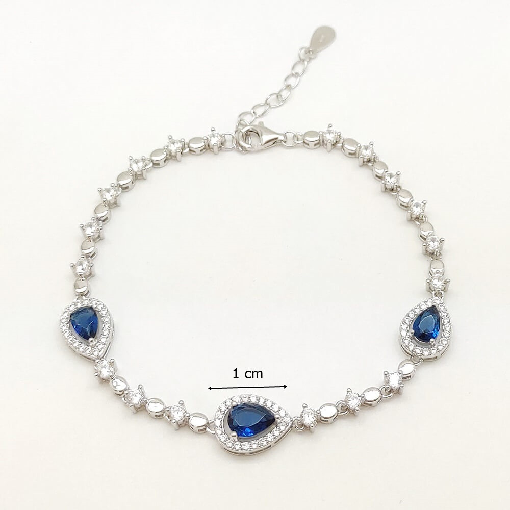 The rhodium plating ensures that the silver does not lose its shine and protects it from oxidation and wear. The teardrop-shaped blue stone pendant gives the bracelet an elegant and sophisticated look that goes perfectly with any outfit. The depth and mystery of the dark blue color give the jewelry a special charm that looks great on any wrist.