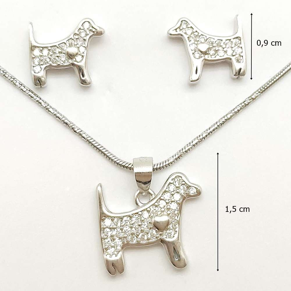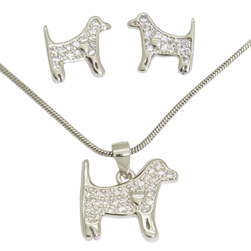 Rhodium-plated silver dog animal jewelry set made of 925 Sterling Silver, decorated with zirconia stones.