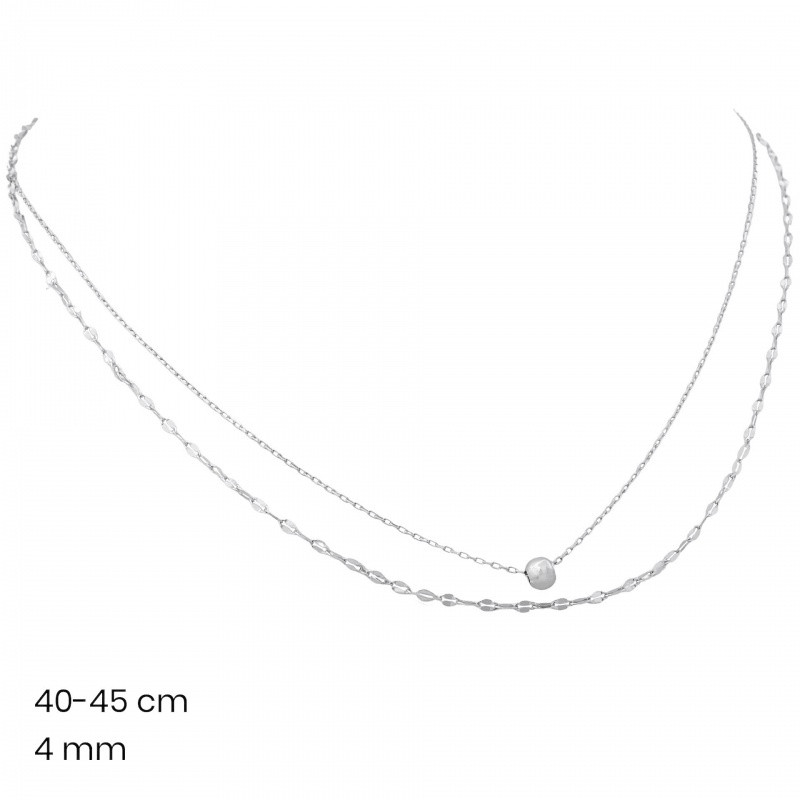 This double-strand silver necklace is both modern and understatedly elegant. The 925 rhodium-plated silver chain rests in two delicate layers on the décolletage, harmoniously unified by a shiny, spherical pendant. The simplicity of the sphere shape adds a touch of luxury, while the multi-layered design of the chain lends the jewelry a playful feel and visual depth.