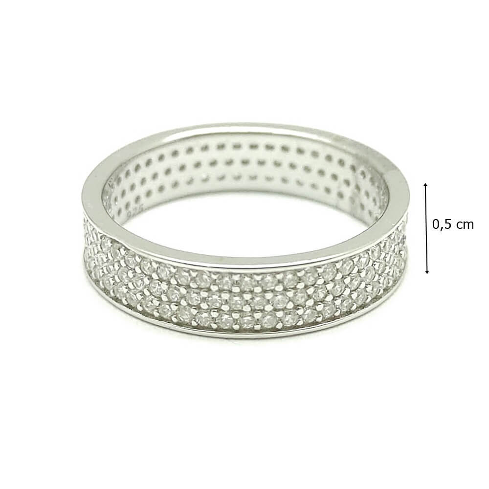 The silver ring with three rows of zirconia stones is a true masterpiece that offers the perfect balance of luxury and sophistication. The 925 purity, rhodium-plated Sterling Silver base material ensures the ring's durability and timeless shine. The ring is decorated with three rows of meticulously placed zirconia stones that evoke the sparkle of diamonds. These stones are arranged to provide maximum refraction and brilliance, creating a stunning look from every angle.