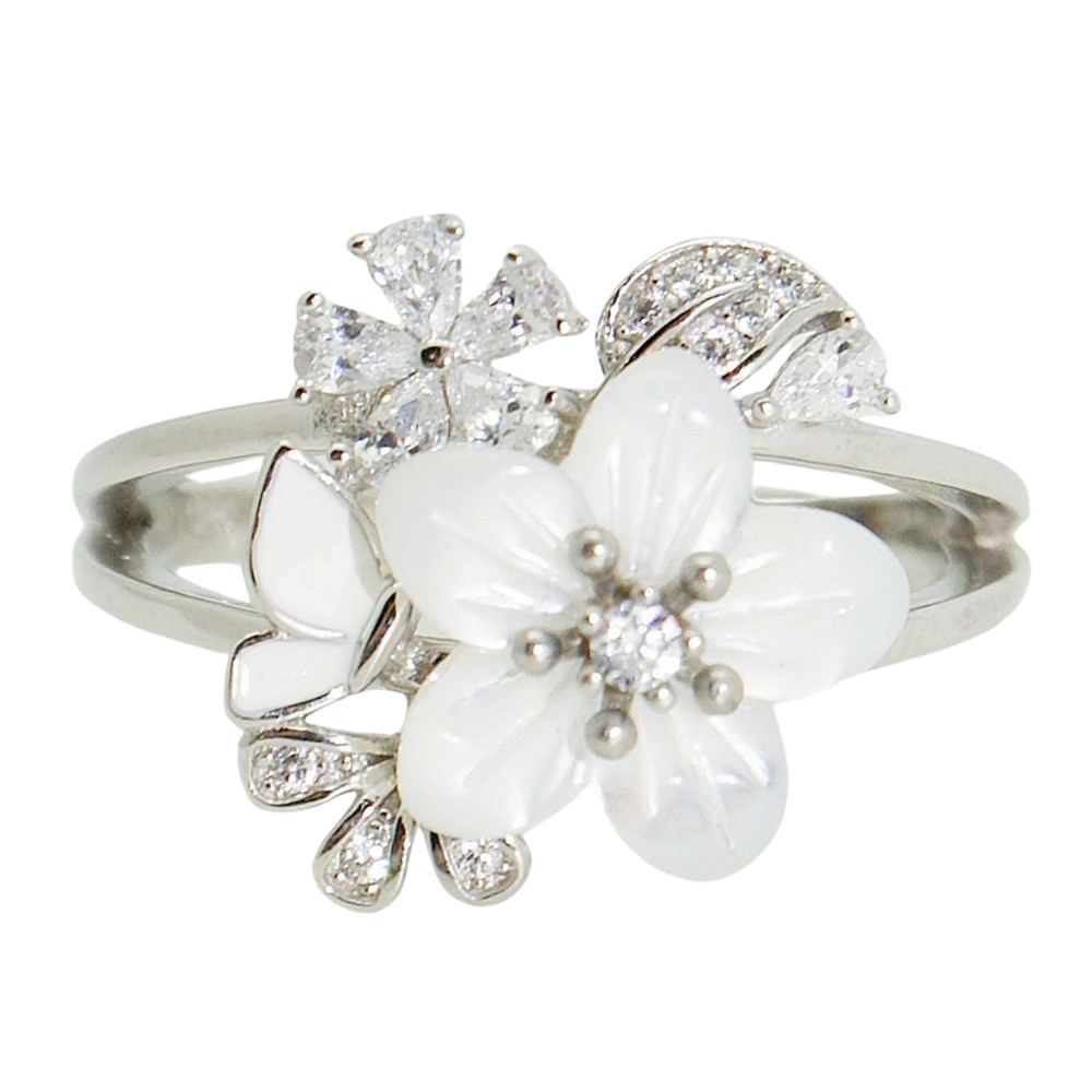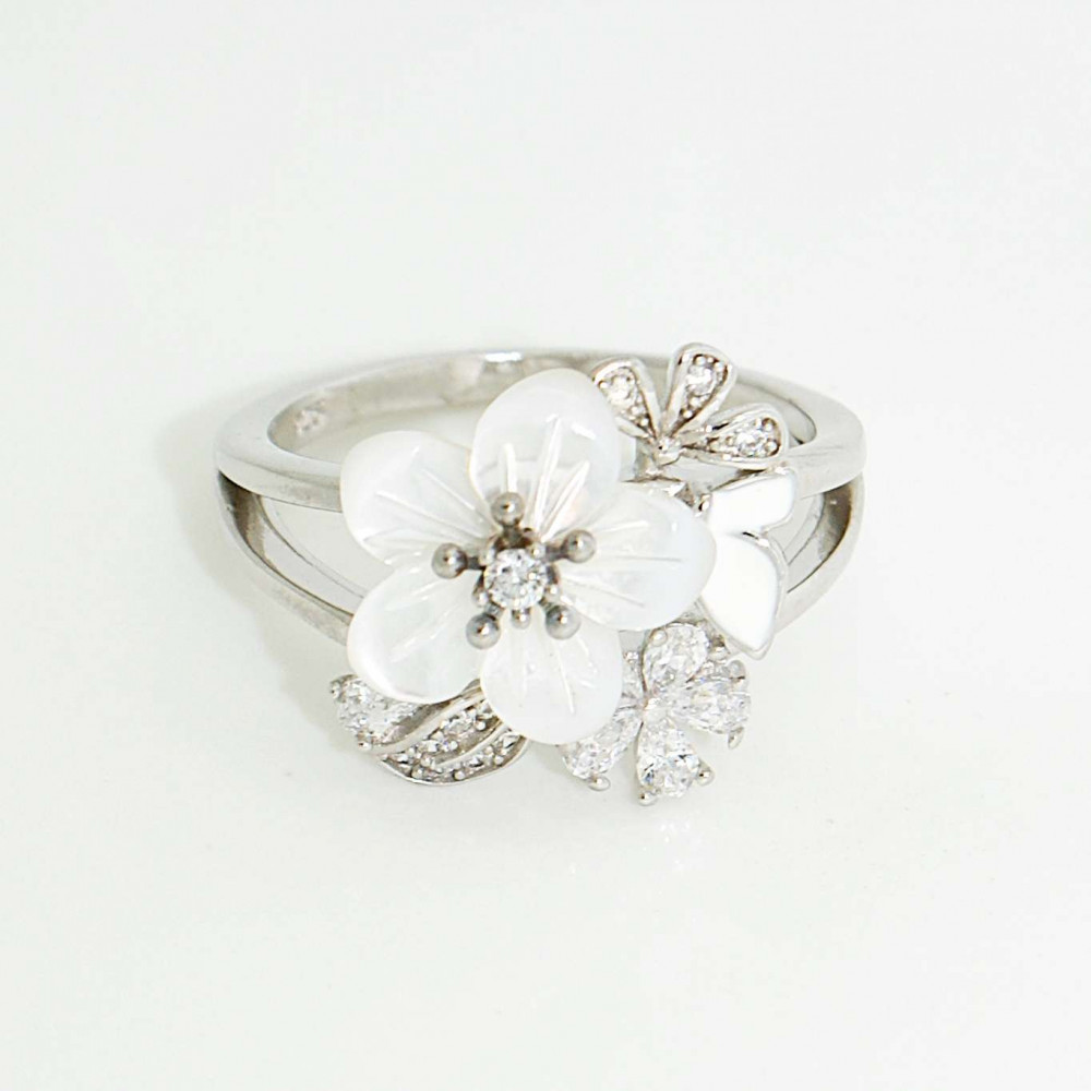 Rhodium-plated silver ring decorated with zirconia stones and mother-of-pearl. All the main elements of the romantic style can be found on it: the beautiful white flower, the tiny butterfly hiding behind the petals, and the meticulously crafted foliage decorated with sparkling zirconia stones.