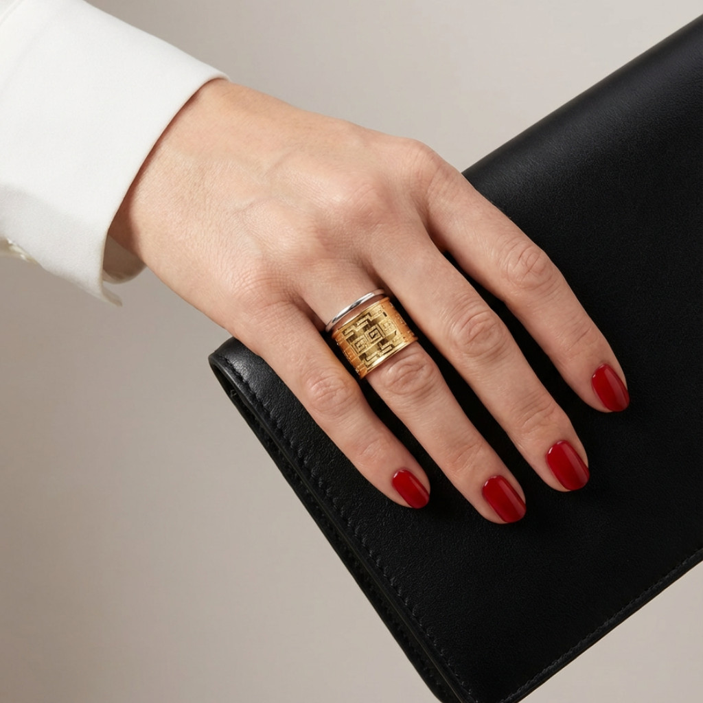 Gold band ring made in Hungary, with Greek pattern. The characteristic river bend pattern is called a meander, which is an angular, repeating, self-returning, snail-like, geometric ancient Greek motif. It was often used to decorate buildings and clothing, but it also carried an important message: it symbolizes eternity and eternal life.