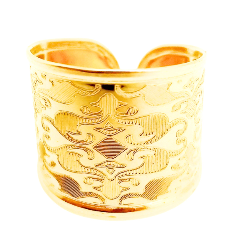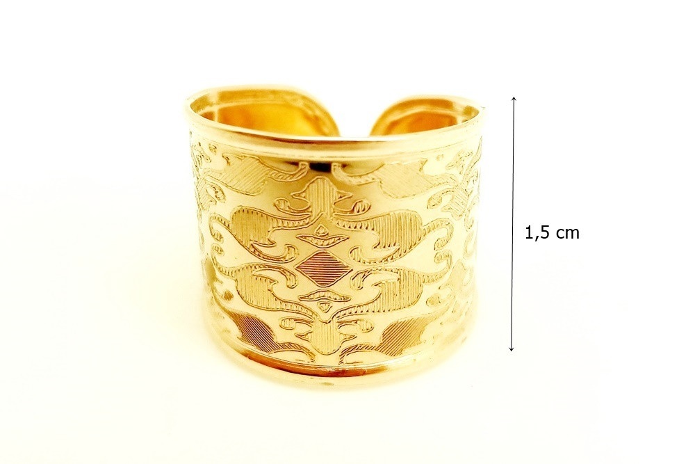 Gold band ring / Wide band with a unique engraved pattern. The stylized pattern with its curving lines reminiscent of flowers looks wonderful on the gold surface and is a splendid accessory for everyday or occasional wear.