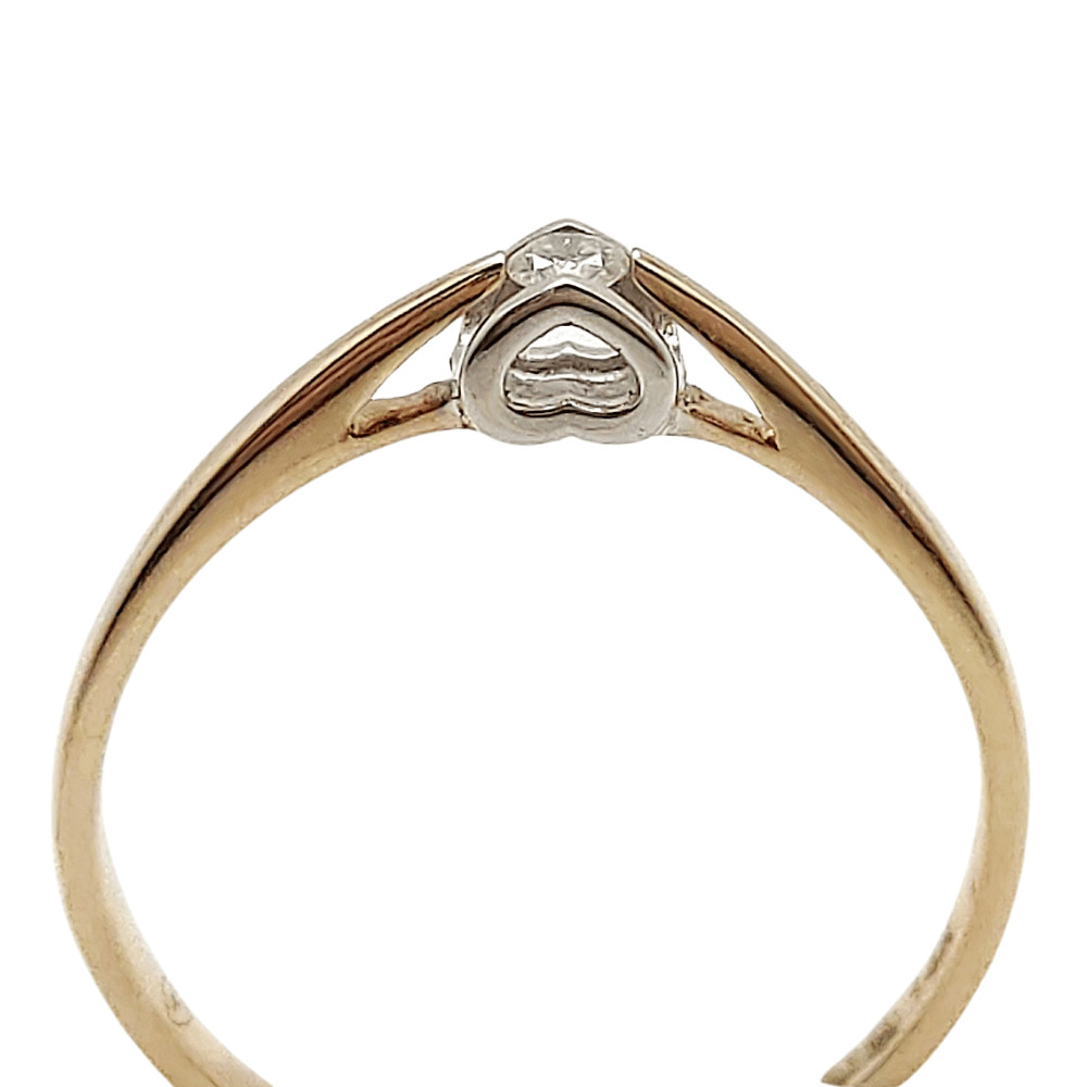 This delicate engagement ring, adorned with a 0.05 carat diamond stone, is made of 14 carat gold and is designed for those who appreciate understated elegance. The centerpiece of the ring is a round-cut diamond set in a special heart-shaped setting, whose sparkle highlights the uniqueness and style of the wearer.