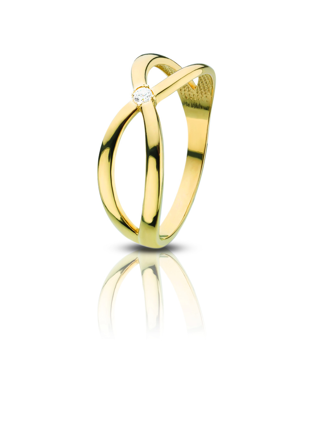 A stunning 14-karat gold ring with bands that converge in an infinity symbol, adorned with a sparkling zirconia stone in the center. The infinity symbol represents eternity or boundlessness, and its loops reflect the balance of opposites: man and woman, day and night. This ring can be a wonderful gift for couples in love or as a Promise ring, as it symbolizes infinite, everlasting love.