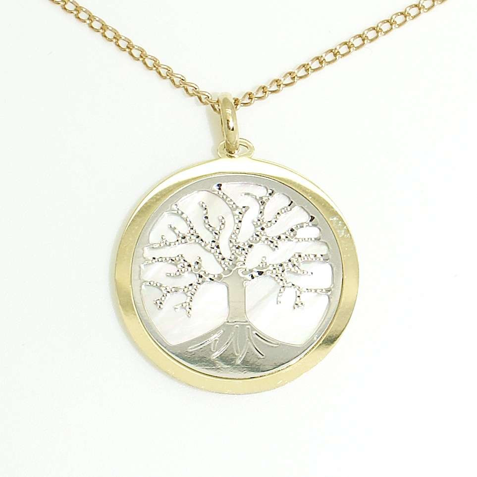 14-karat bicolor yellow and white gold pendant with mother-of-pearl inlay and tree of life motif. The tree of life jewelry creates a connection between life and nature, emphasizing the concepts of interconnectedness and eternal life, thus serving as a powerful reminder of personal development and progress in life. The Mother-of-Pearl Tree of Life gold pendant features finely crafted details that further emphasize the beauty and harmony of nature.