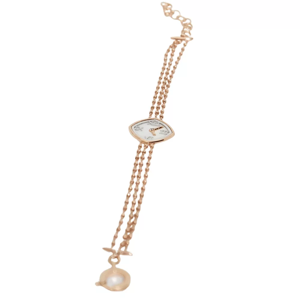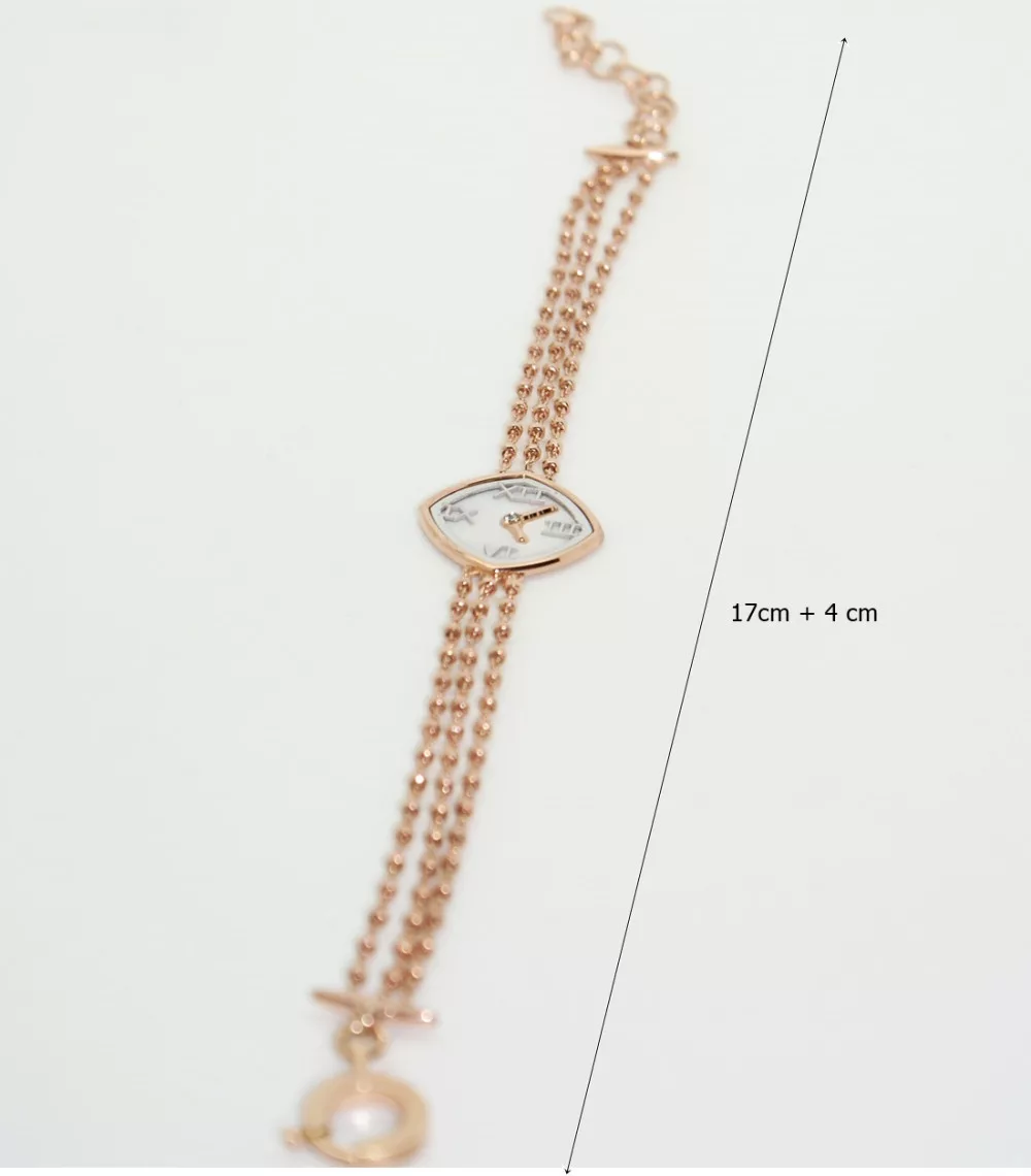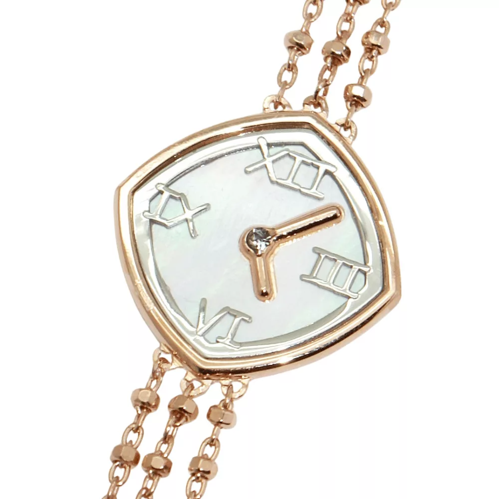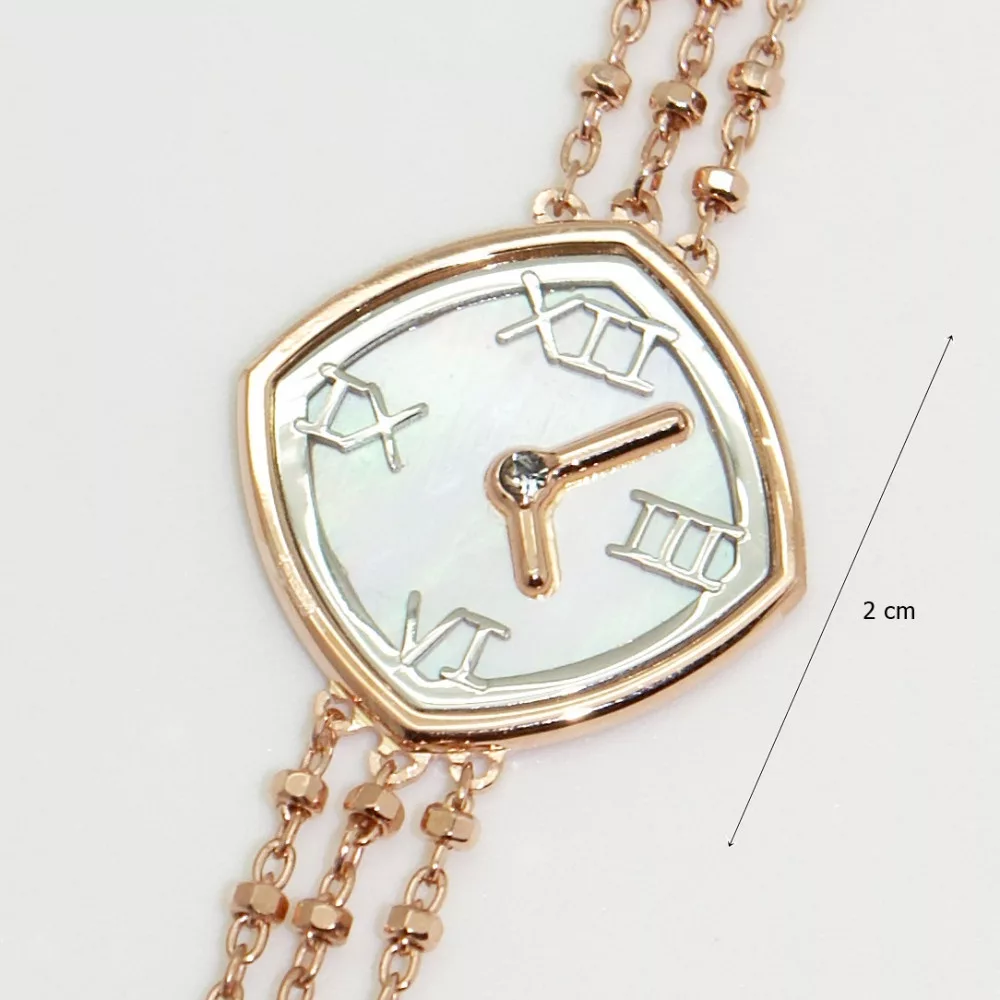 This 14-karat rose gold-plated watch pattern bracelet is truly unique. If you don't like wearing watches on your wrist but love the watch motif itself, then this bracelet was made for you, as it is a decorative mother-of-pearl watch. This means that the clock is only a design, it has no mechanism and does not function as a real clock. The bracelet is adjustable, so it will definitely fit your wrist. You can wear it with an elegant business outfit, but you can also make a masculine outfit more feminine with this Gold Time silver bracelet in rose gold-tone color.