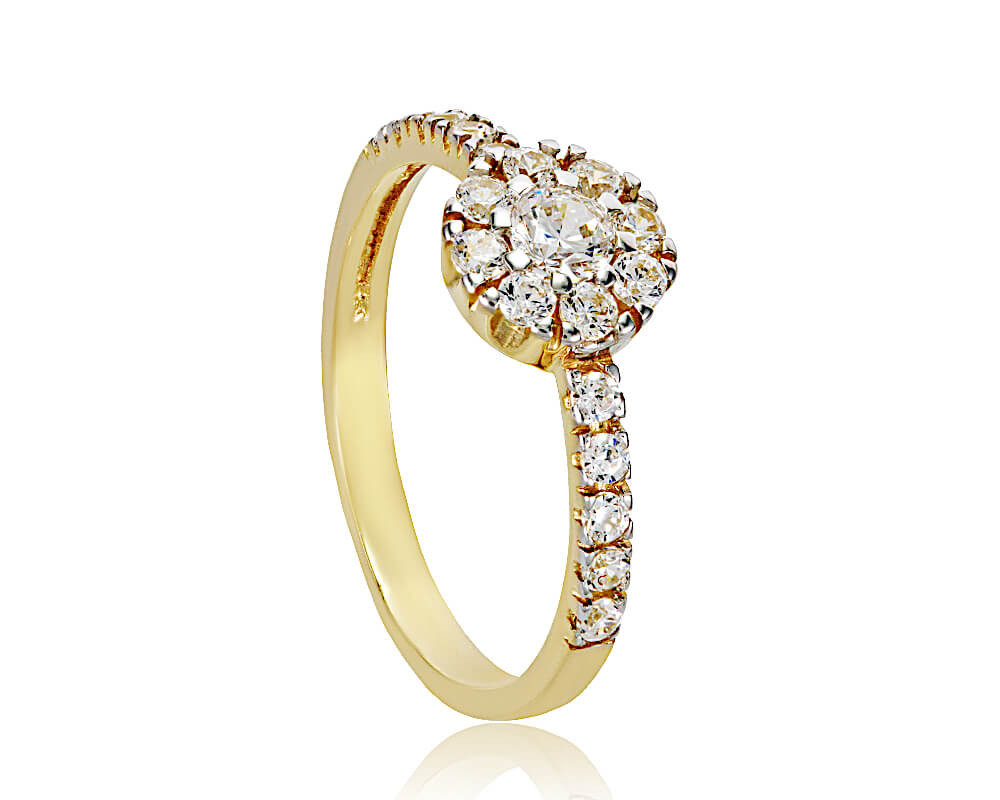 Delicate details, beautiful balance - the Grace gold engagement ring embodies classic beauty from every angle. The central zirconia stone is surrounded by eight smaller, sparkling stones in a halo shape, delicately enhancing its brilliance. The sides of the ring band are decorated with 5-5 tiny stones that blend perfectly with the gold surface, adding even more depth and shine to the ring as a whole.