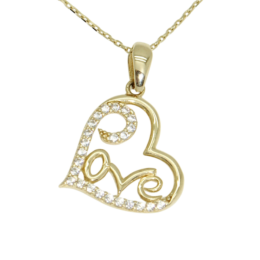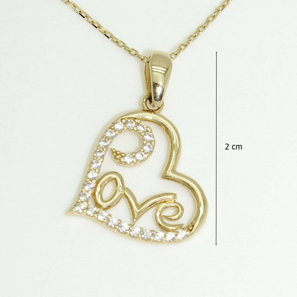 A charming 14-karat gold heart pendant decorated with the word LOVE, partially encrusted with zirconia stones. It is the perfect gift for your loved one on Valentine's Day, their birthday or anniversary, and they can wear it around their neck all the time. The Love heart-shaped gold pendant will remind them of you forever and cheer them up whenever they see themselves in the mirror or draw strength from it when they are facing a difficult decision, gently holding it in their hand and thinking of you.