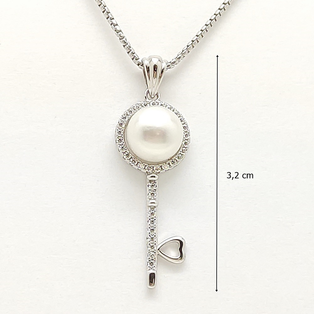 The key and heart silver pendant with zirconia and pearls is an elegant and timeless piece of jewelry that can be the perfect accessory for your everyday outfits. It is made of high-quality sterling silver, which ensures the pendant's durability and shine. The key symbolizes the opening of doors and new opportunities, while the heart symbolizes love, so wearing it can have a special meaning for you.