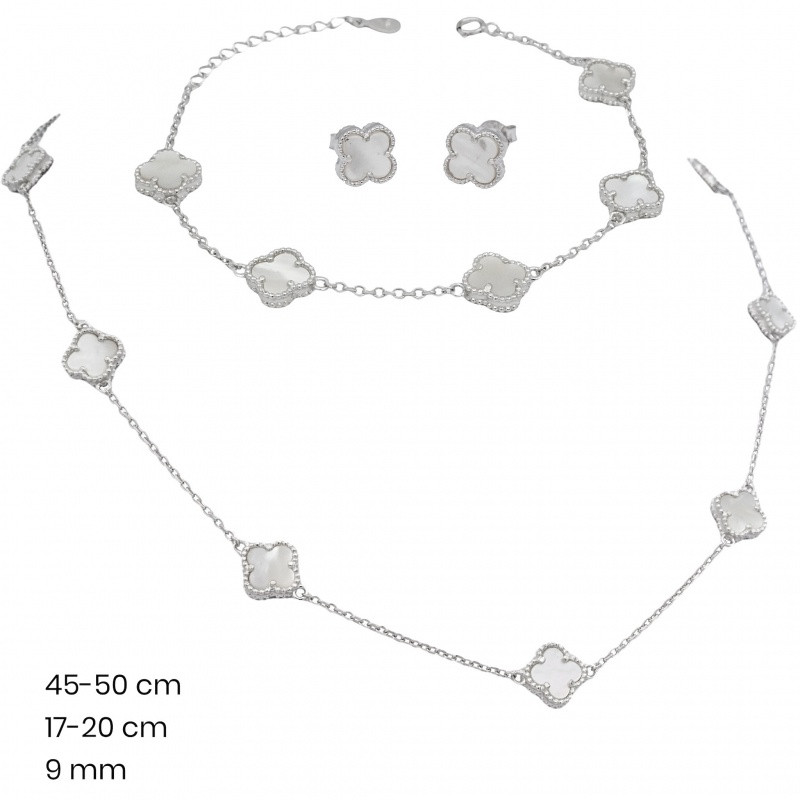 This three-piece silver jewelry set decorated with mother-of-pearl is a combination of luck and elegance. The four-leaf clover motif is highlighted by delicate mother-of-pearl inlays that shine softly on each piece of the necklace, bracelet, and earrings.