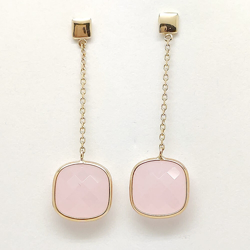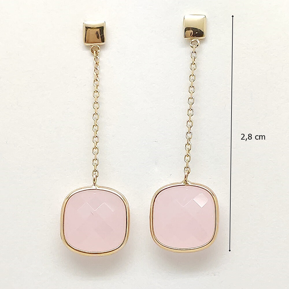 Beautiful pale pink gemstone drop / dangle earrings with 1 rose quartz stone each. The delicacy and beauty of 14-karat yellow gold is highlighted by the pastel-colored stone, which hangs on a thin Anker chain, creating a feminine and elegant look. Wear them with a white T-shirt and jeans, or use them to spice up your casual outfit. They look best with short hair or an updo.