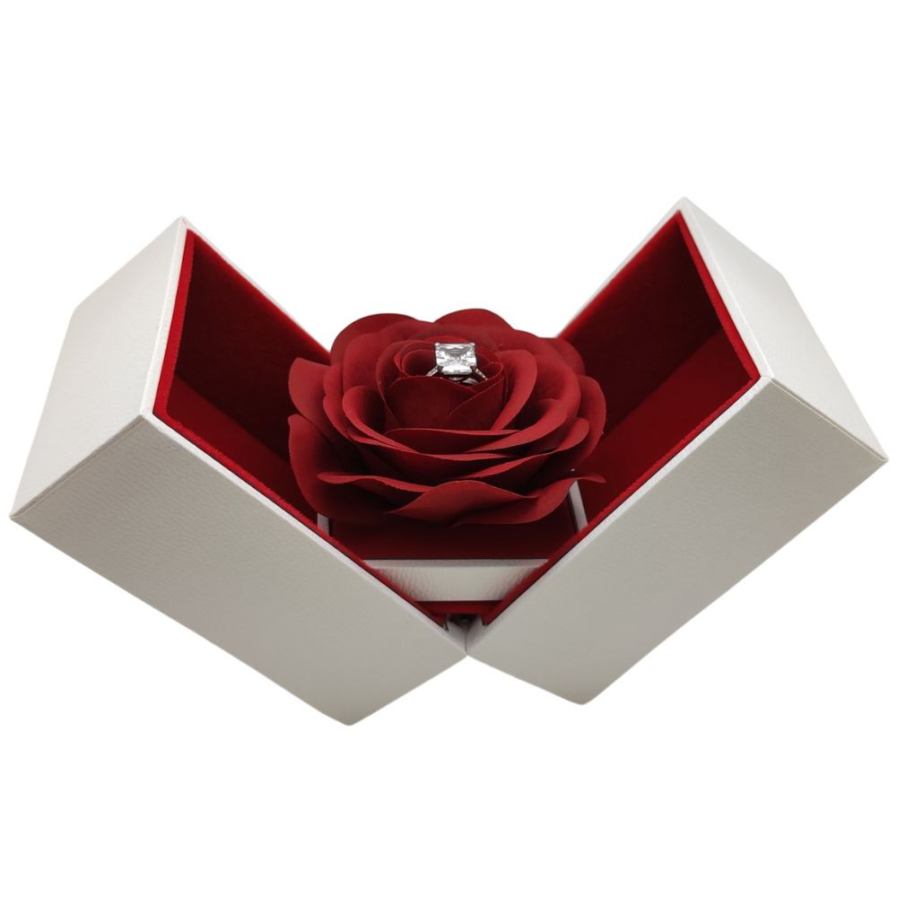 This red rose-shaped jewelry box is the perfect embodiment of refined elegance and romantic gestures. The outer cover of the box is velvety soft, and its detailed petals create a realistic effect. When you open it, you will find a beautifully shaped petal interior with a special place for the ring in the center. It is the ideal choice for presenting an engagement ring or as a surprise gift for any romantic occasion.
