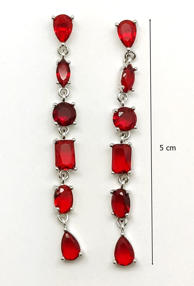 These red stone drop / dangle silver earrings are a real eye-catching piece of jewelry that will enhance any outfit. The earrings are made of finely crafted 925 Sterling Silver and adorned with sparkling red stones, exuding elegance and style.