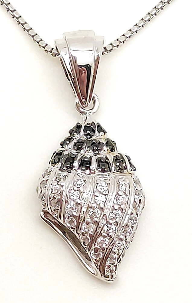 Spectacular silver sea cone snail animal pendant, decorated with sparkling black and white zirconia stones. Made from high-quality 925 Sterling Silver, which is not only durable but also hypoallergenic, making it ideal for those with sensitive skin. (The chain is for illustration only and is not part of the jewelry.) Delivered to you in a decorative box.