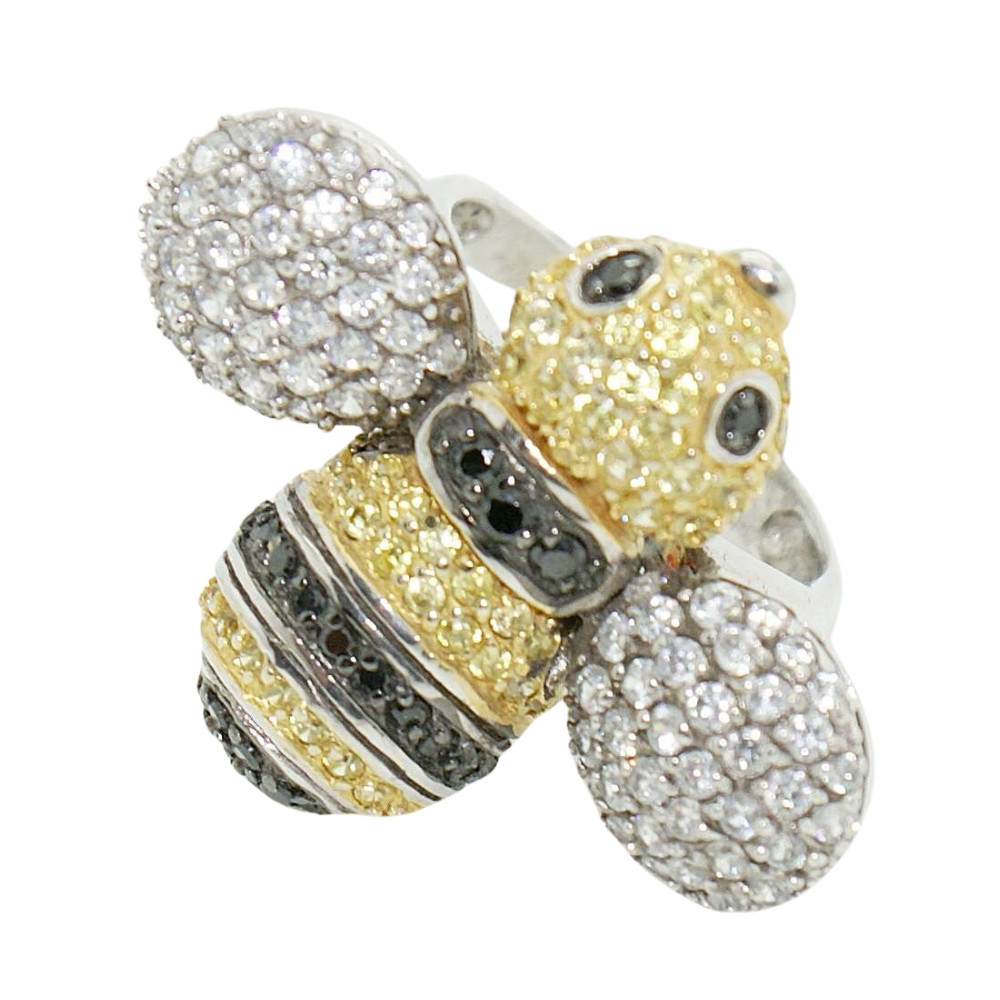 Rhodium-plated adjustable silver ring (925) with a dazzling bee motif, decorated with sparkling yellow, black, and white zirconia stones. The bee is a symbol of diligence and perseverance, and this animal ring reminds us that even such a tiny creature can be vital to sustaining life.