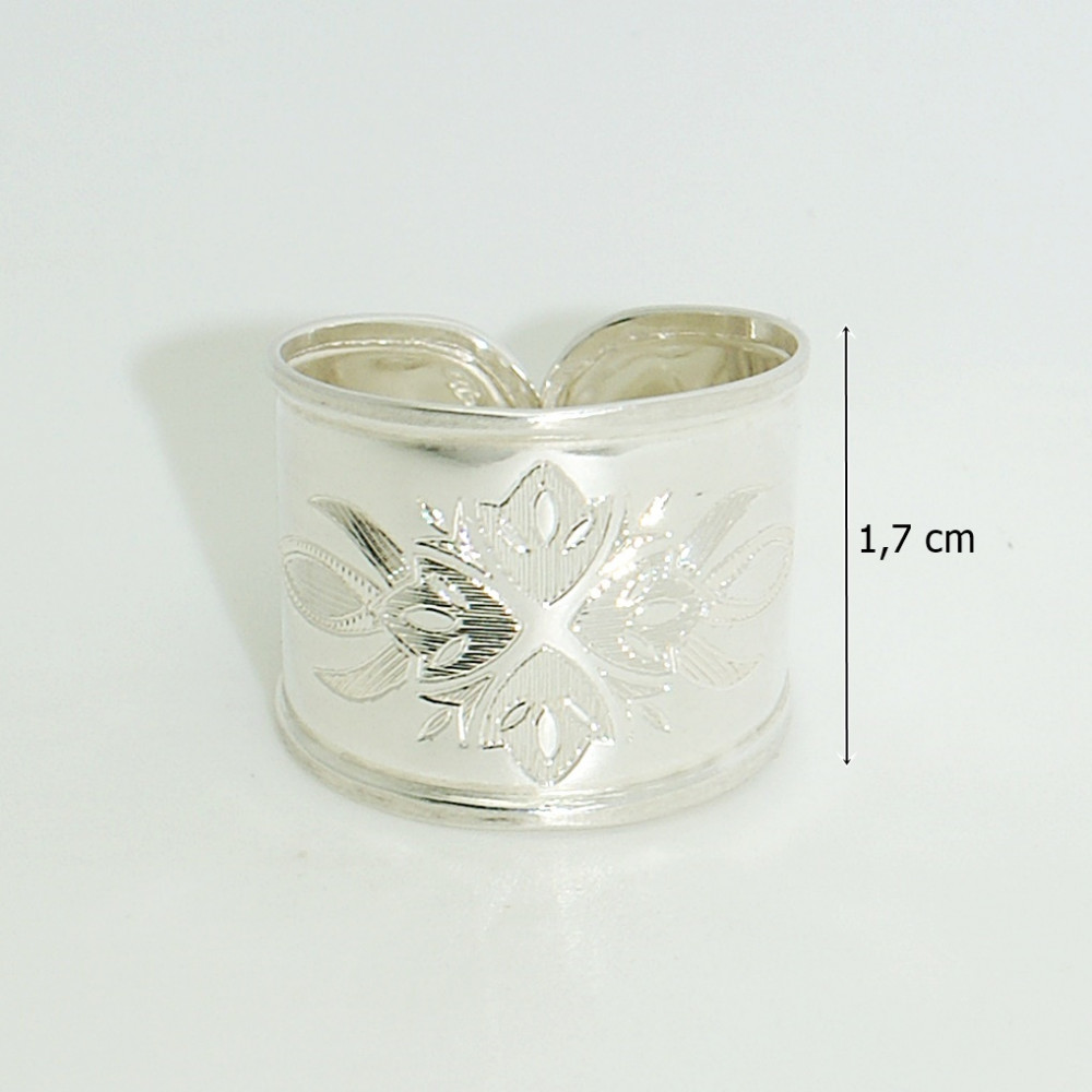 Silver band ring made in Hungary with a stylized flower pattern. The flower is a symbol of spring, and with it, love, youth, joy of life, and vitality. It is a popular motif in folk art, but also frequently appears in the fine arts. It is a truly feminine symbol.