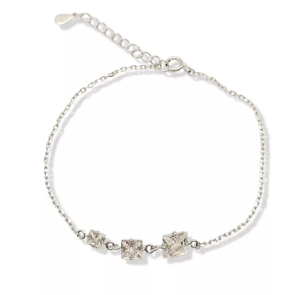 This 925 Sterling Silver bracelet with 3 square zirconia stones is designed for those who love clean lines. It is both modern and delicately feminine. The three precisely cut square zirconia stones are elegantly positioned in the center of the chain, creating a discreet yet dazzling focal point. The delicate workmanship and lightness of the bracelet ensure comfortable wear, even all day long.