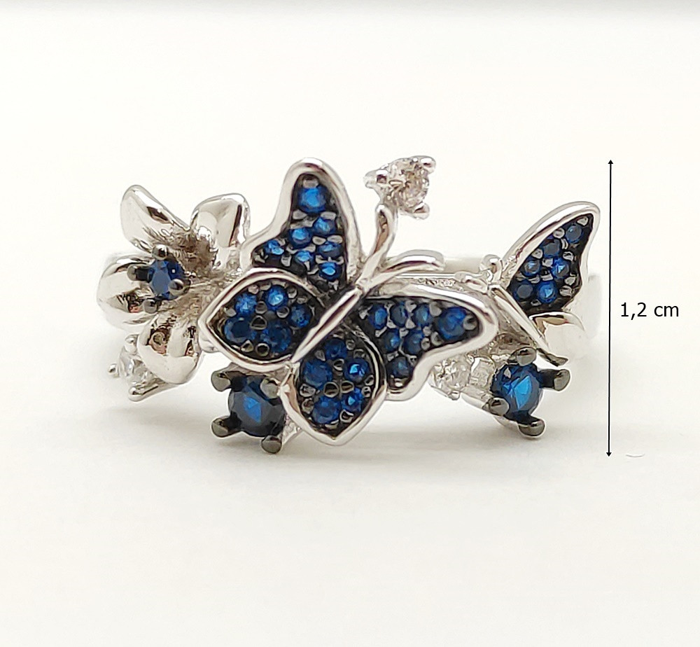 The sapphire blue zirconia stone shines beautifully and contrasts delicately with the silver, enchanting you with every glance. The meticulous craftsmanship of the butterfly shape and the combination of sparkling stones make this ring the perfect accessory for everyday wear or special occasions. This ring is not only stylish but also comfortable, so you can wear it anytime.