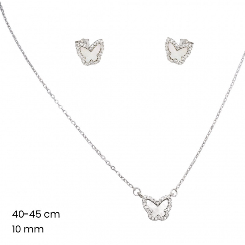 Discover the combination of a silver chain with a mother-of-pearl butterfly pendant and matching animal earrings that will make every appearance special. The 925 Sterling Silver chain with rhodium plating exudes elegance and style thanks to its delicate craftsmanship, while the pearl butterfly pendant captivates with its magical shine and detailed design.