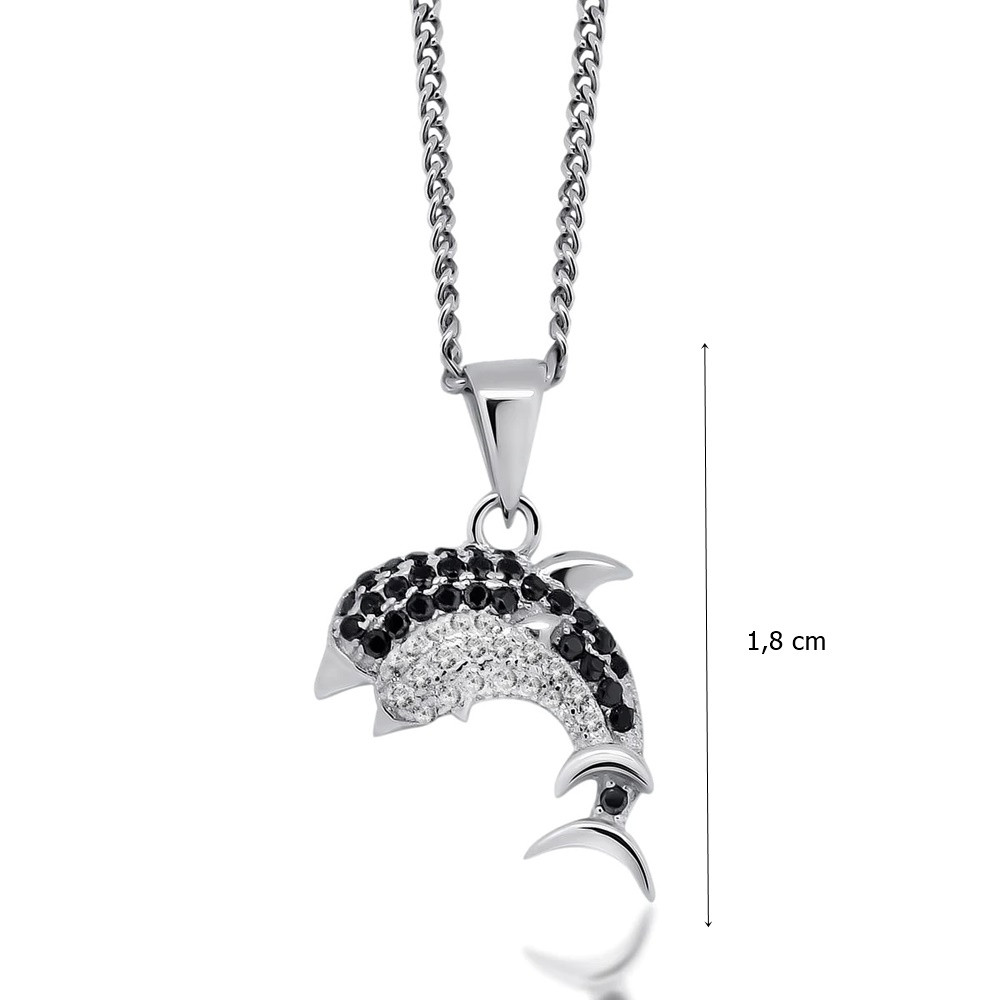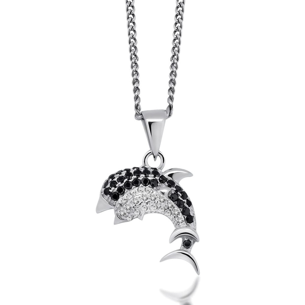 Silver dolphin pendant with black and white zirconia