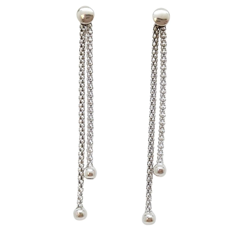 These double-row drop / dangle earrings are truly unique and eye-catching. The delicately sparkling chains made of 925 Sterling Silver move playfully, giving them a dynamic look. The rhodium coating ensures the durability and scratch resistance of the jewelry.