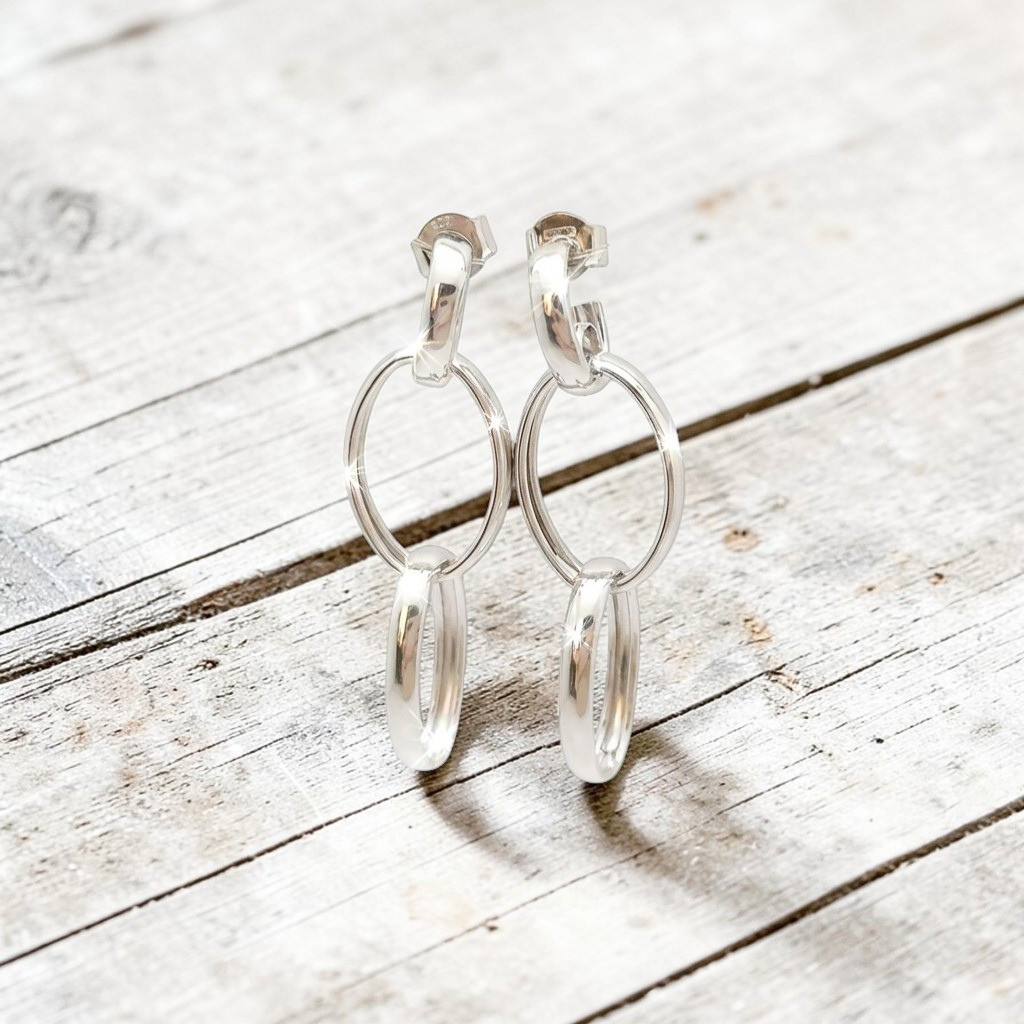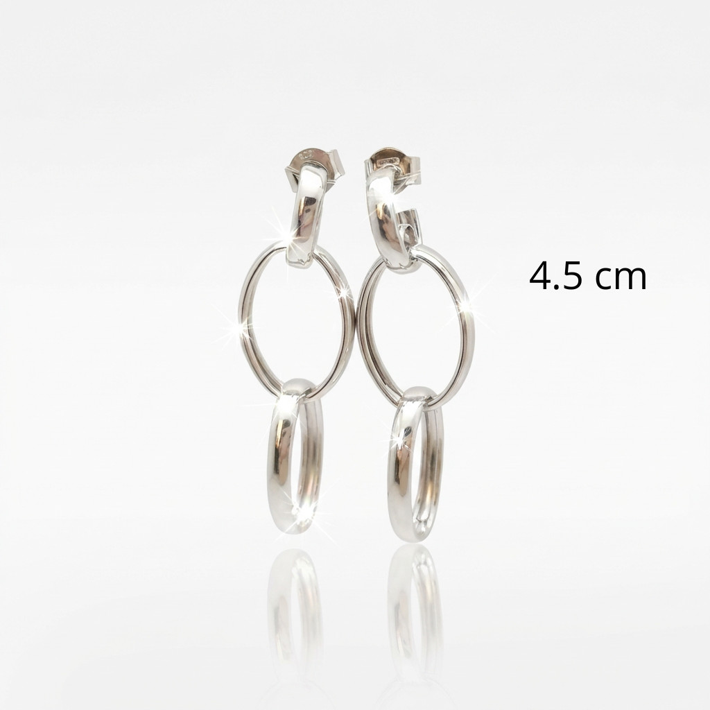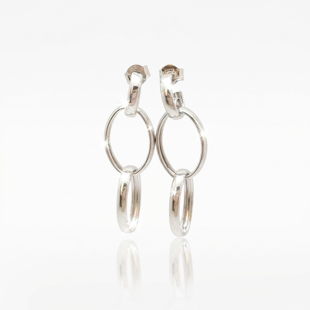 These silver earrings with two interlocking hoops offer a unique yet clean design. The 925 Sterling Silver base material is protected by a rhodium coating, which preserves its shine and resists wear and tear. The dangling rings move gently when worn, creating a dynamic and youthful effect.