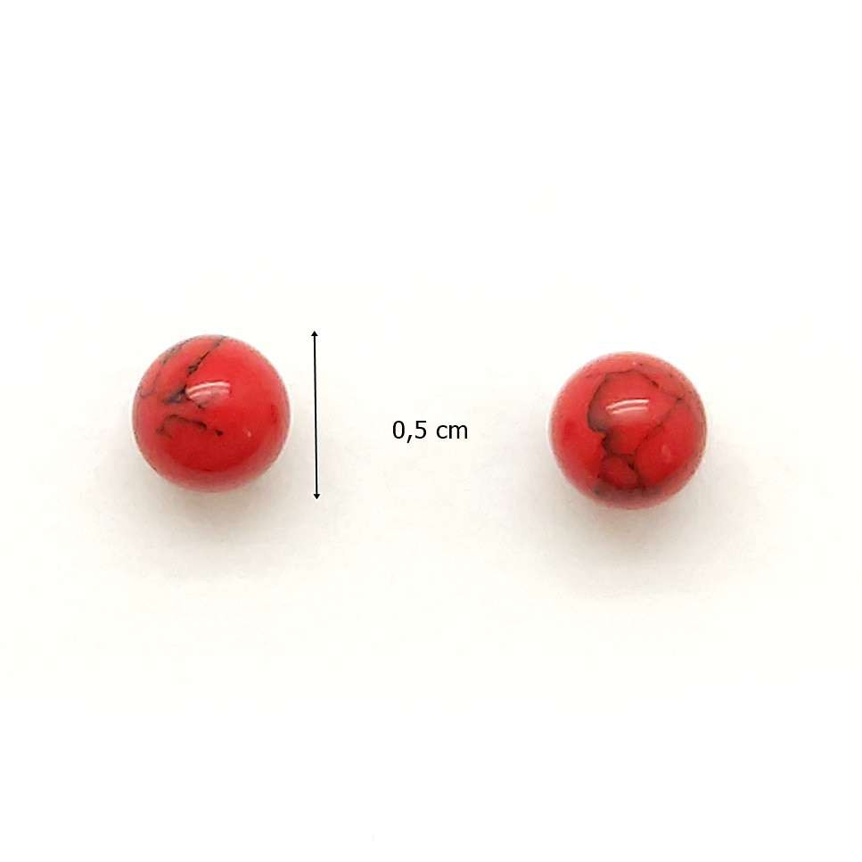 Coral ball earrings with silver stems. In Tibetan and Indian culture, coral is one of the five sacred stones: it symbolizes vitality. Ball diameter: 5 mm.