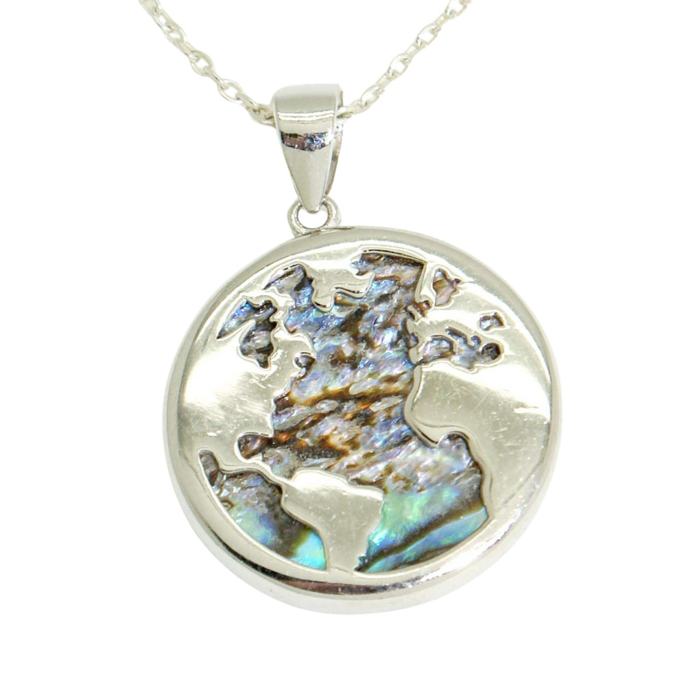 A magical silver pendant with an Earth motif and multicolored mother-of-pearl decoration.