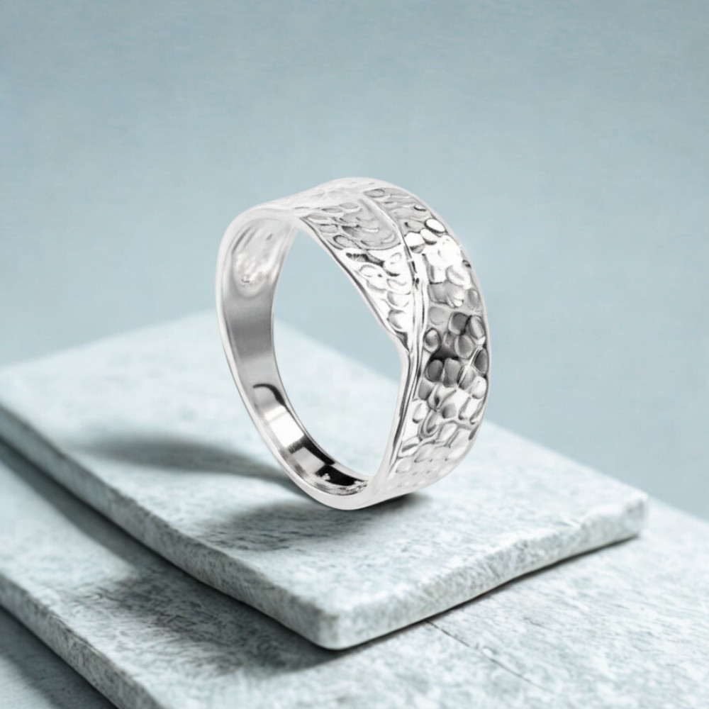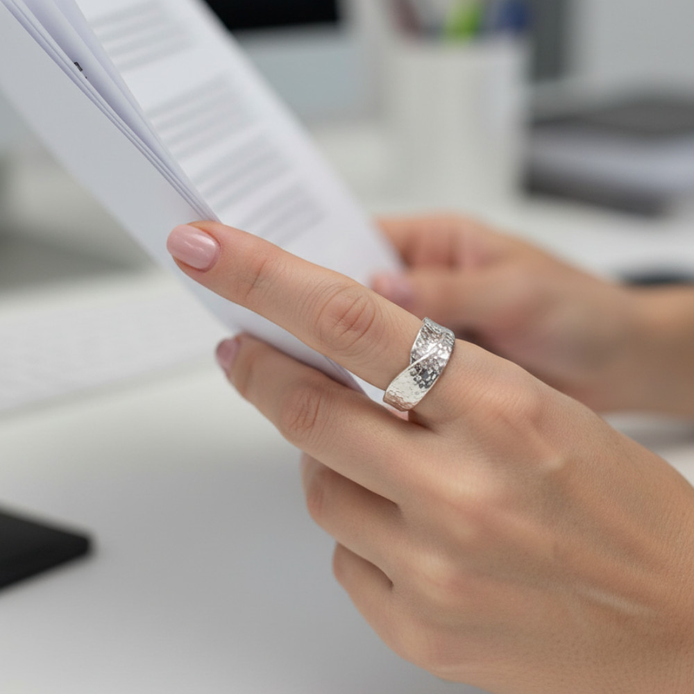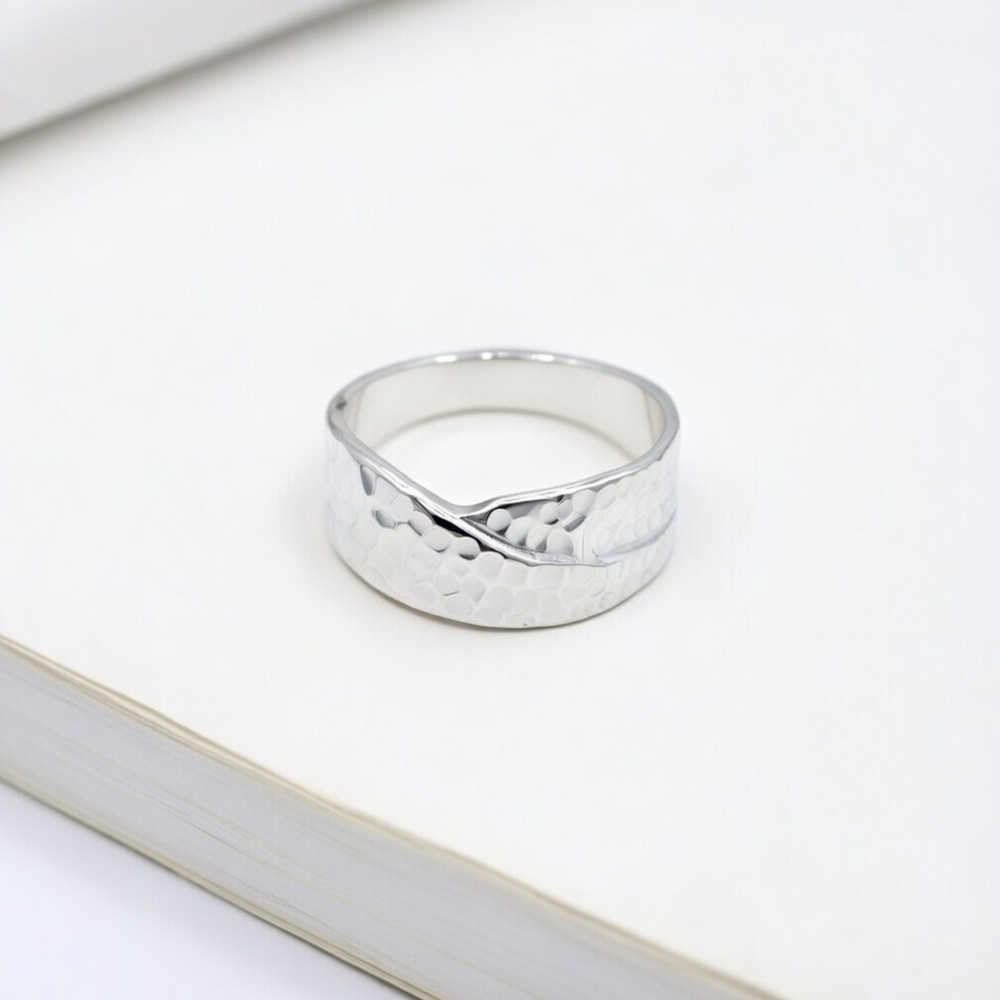 Style tip for you: This asymmetrical ring is a great match for both minimalist and bohemian styles. It looks great worn on the index finger or thumb, especially if you like more masculine, bold jewelry. Pair it with matte-textured fabrics, such as linen or wool, to accentuate the raw, hammered style of the silver.