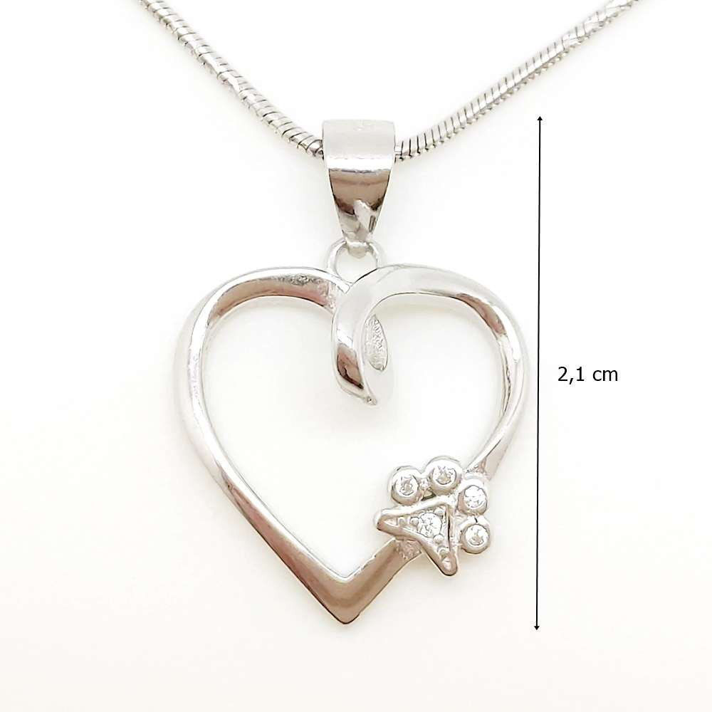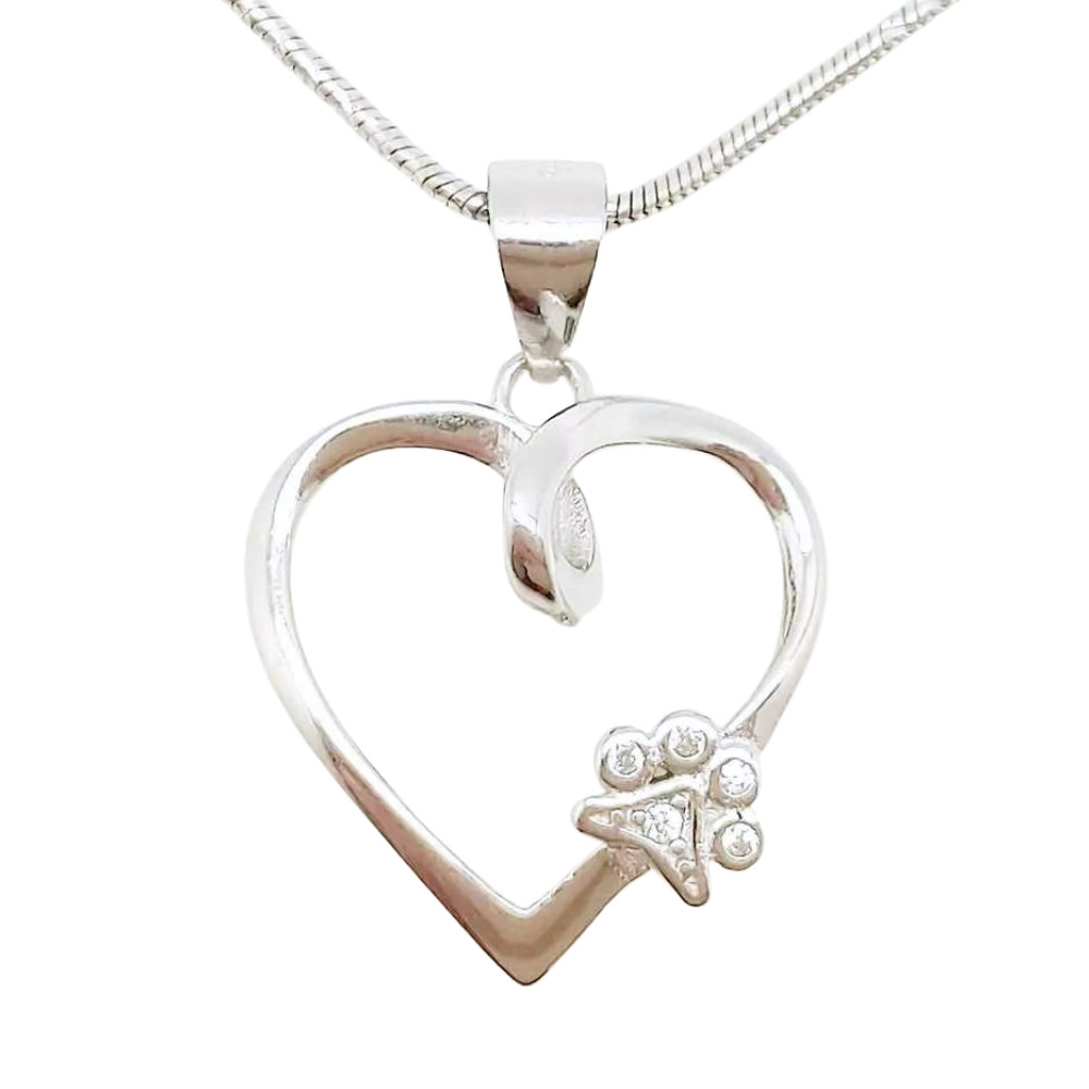 Silver heart-shaped animal pendant with a small paw print on one side of the heart, set with zirconia stones. Made of high-quality 925 Sterling Silver, which is not only durable but also hypoallergenic, making it ideal for those with sensitive skin. A lovely gift for animal lovers. (The chain is for illustration only and is not included in the jewelry.)