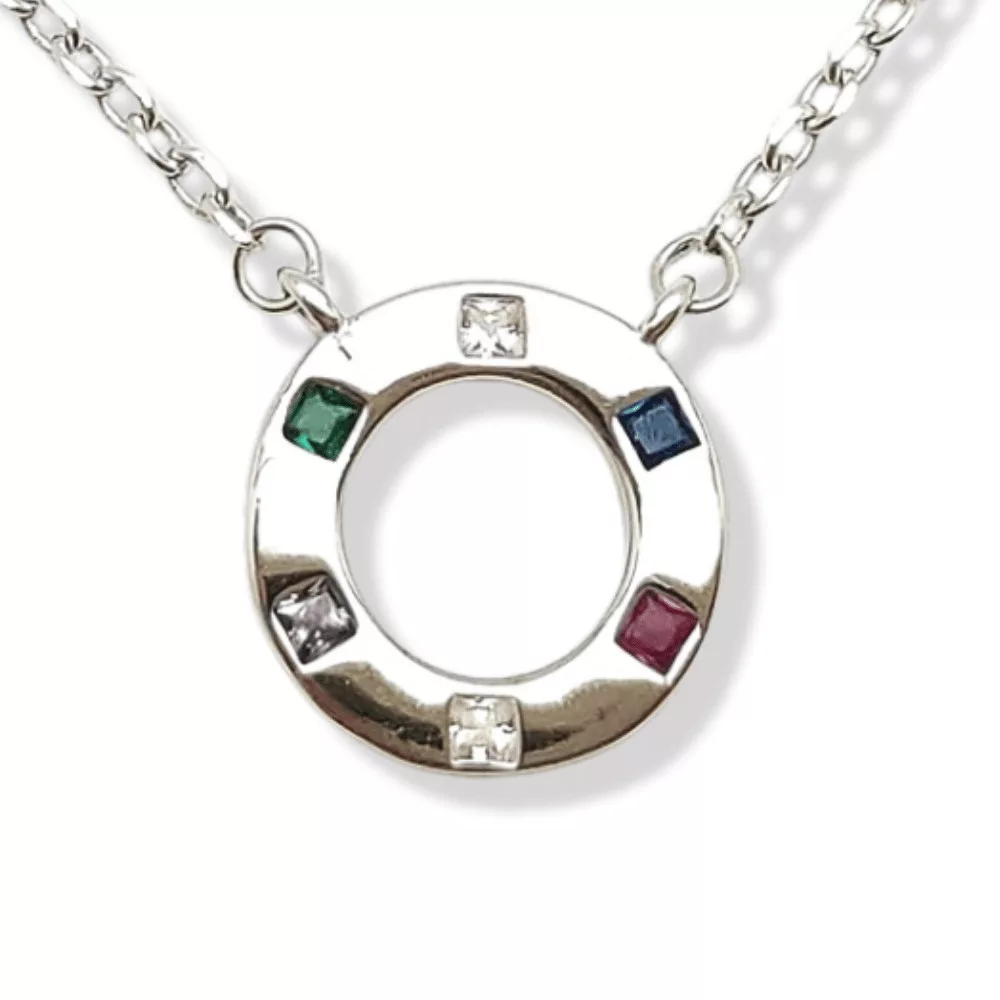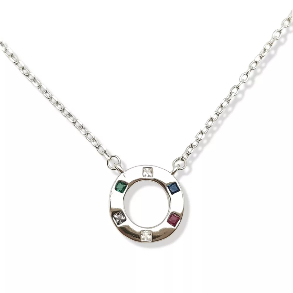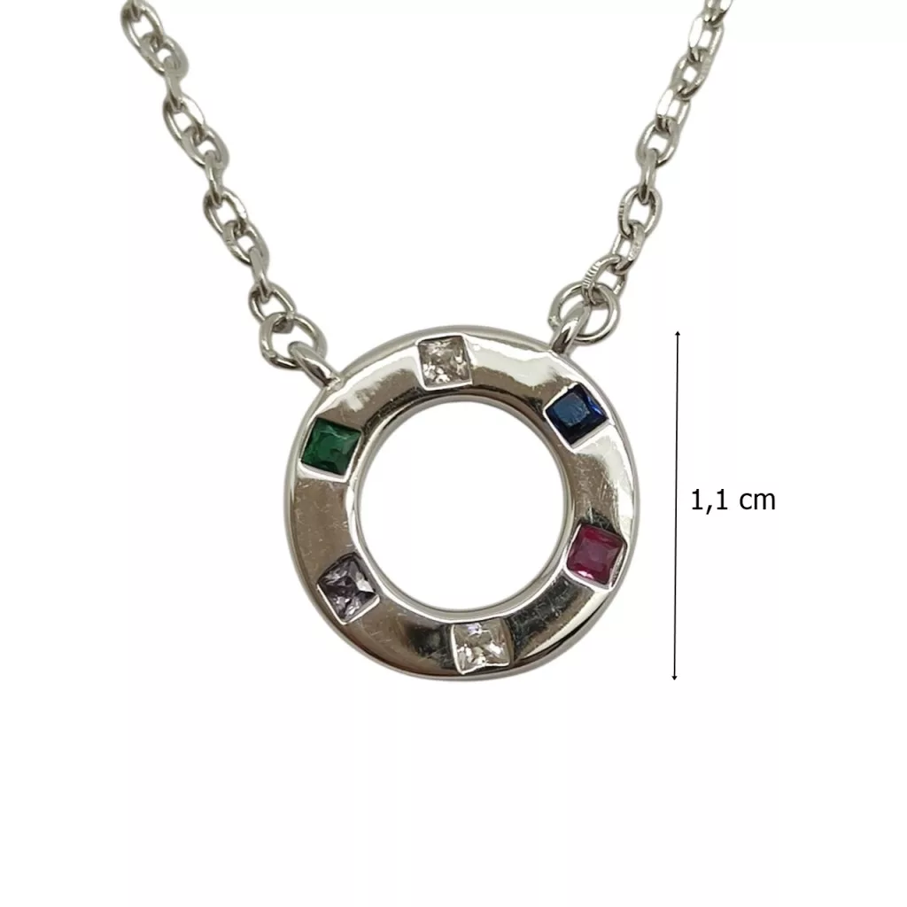 This unique silver necklace with a circle pendant and colorful zirconia stones is a combination of playful femininity and modern design. The circular shape of the pendant evokes eternal wholeness and balance, while the colorful zirconia crystals set within it radiate vibrant energy and freshness. The chain is made of 925 Sterling Silver and gently wraps around the neck, serving as an elegant accessory for any occasion.