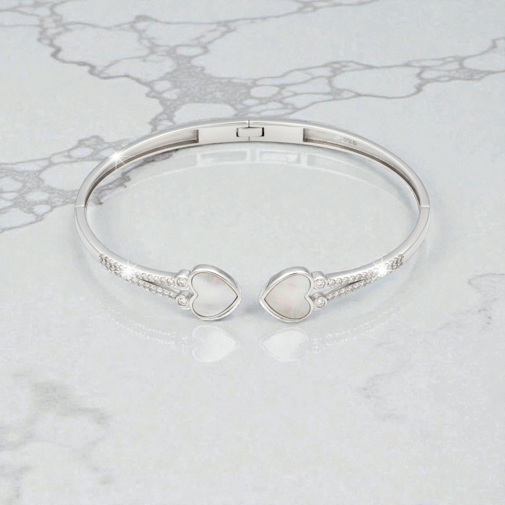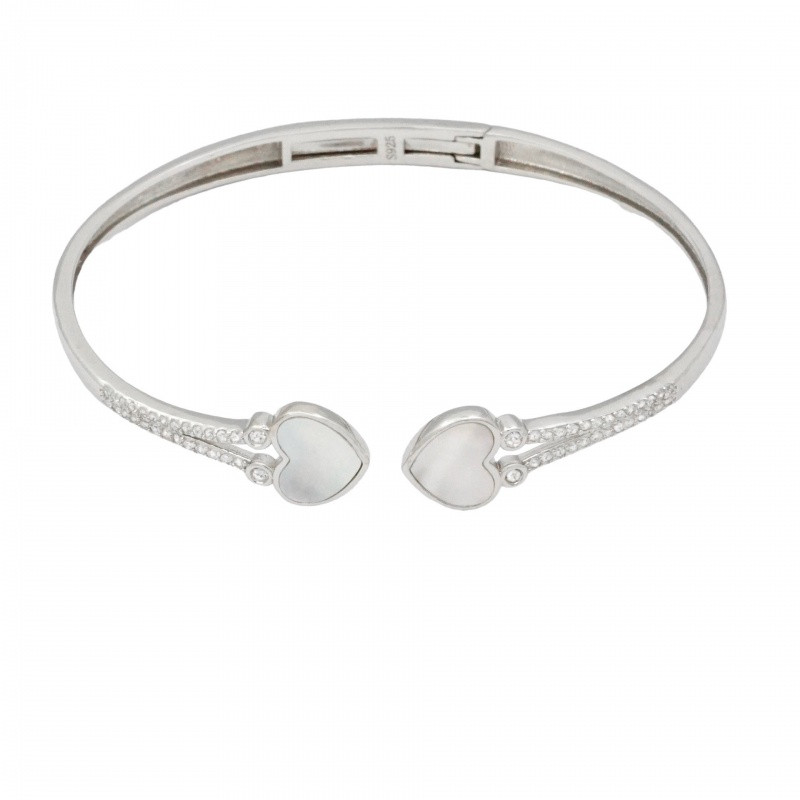 This silver bangle bracelet is made of 925 Sterling Silver with a rhodium coating to maintain its shine and resist oxidation over time. The open-ended cuff features mother-of-pearl accents that add a touch of sophistication and elegance. The soft, natural sheen of the mother-of-pearl combined with the cool sparkle of the silver makes this bracelet a true symbol of elegance and timeless style.