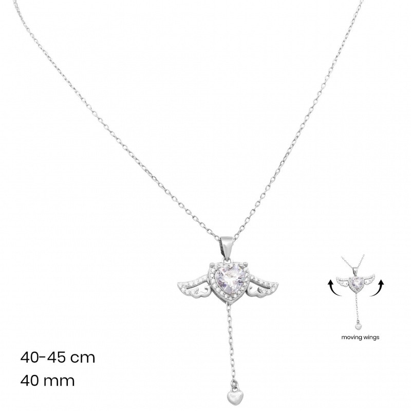 The heart shape symbolizes love and care, while the moving wings symbolize freedom and protection. This necklace looks especially good with casual outfits, but can also be worn on a daily basis if you want to spice up your look a little. The elegant shine of the silver material highlights every detail of the pendant.