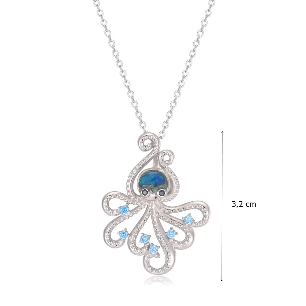 This silver pendant with a blue octopus is a truly unique and stunning piece of jewelry that brings the mystical world of marine life to you. The pendant is made of 925 sterling silver, which, thanks to its careful craftsmanship, faithfully reproduces every detail of the octopus. The octopus's tentacles curl delicately, as if it were swimming in the depths of the ocean, while the blue color highlights the special magic of marine life.
