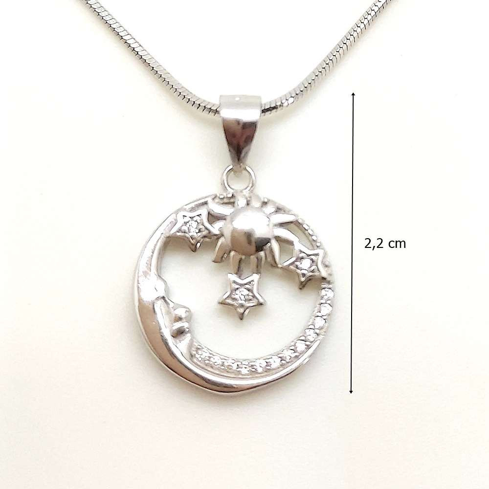 This silver pendant with Sun, Moon and stars motif is a true cosmic jewel that embodies the beauty and mystery of the universe. The pendant is finely crafted from 925 Sterling Silver and decorated with symbols of the sun, moon, and stars, which represent cosmic forces and the eternal cycle of life.
