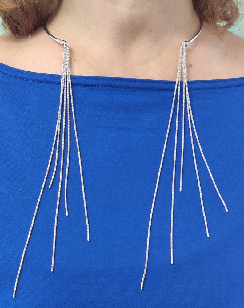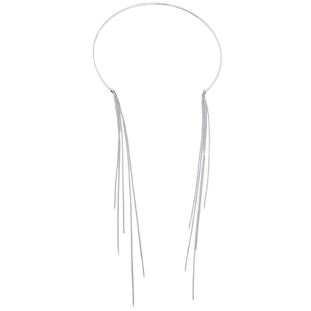 This rigid necklace made of 925 Sterling Silver has a modern and bold design. The solid, rigid structure of the necklace fits perfectly to the neckline, while the hanging strands add dynamism and uniqueness to the jewelry. The rhodium coating guarantees durability and shine, making the necklace a timeless accessory.
