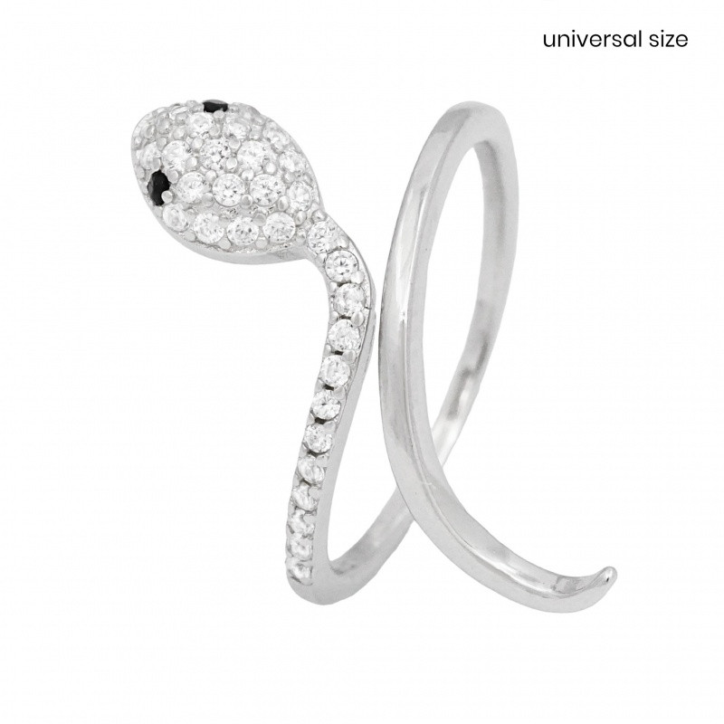 This 925 Sterling Silver ring is shaped like a snake. In ancient cultures, the snake motif is a symbol of renewal, rebirth, and protection. The silver ring is unique in that it features two small black stones on the snake's head, representing the snake's eyes, which give the jewelry a mysterious, mystical feel. The ring's detailed craftsmanship and dynamic lines give it a modern and edgy look.