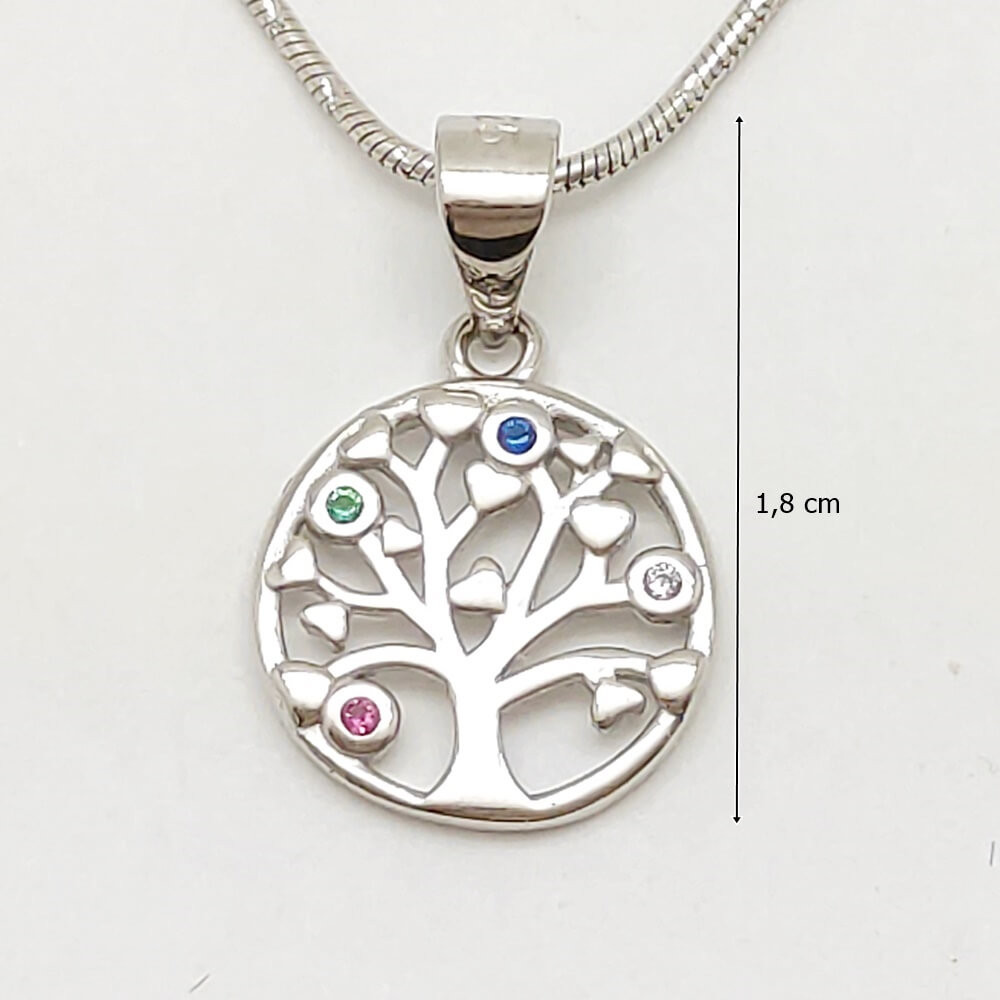 Enchanting silver pendant with tree of life motif and colorful zirconia stones. Made of high-quality 925 Sterling Silver, which is not only durable but also hypoallergenic, making it ideal for those with sensitive skin. The tree of life jewelry creates a connection between life and nature, emphasizing the concepts of interconnectedness and eternal life, thus serving as a powerful reminder of personal growth and progress in life. The silver pendant features finely crafted details that further emphasize the beauty and harmony of nature. (The chain is for illustration only and is not part of the jewelry.)