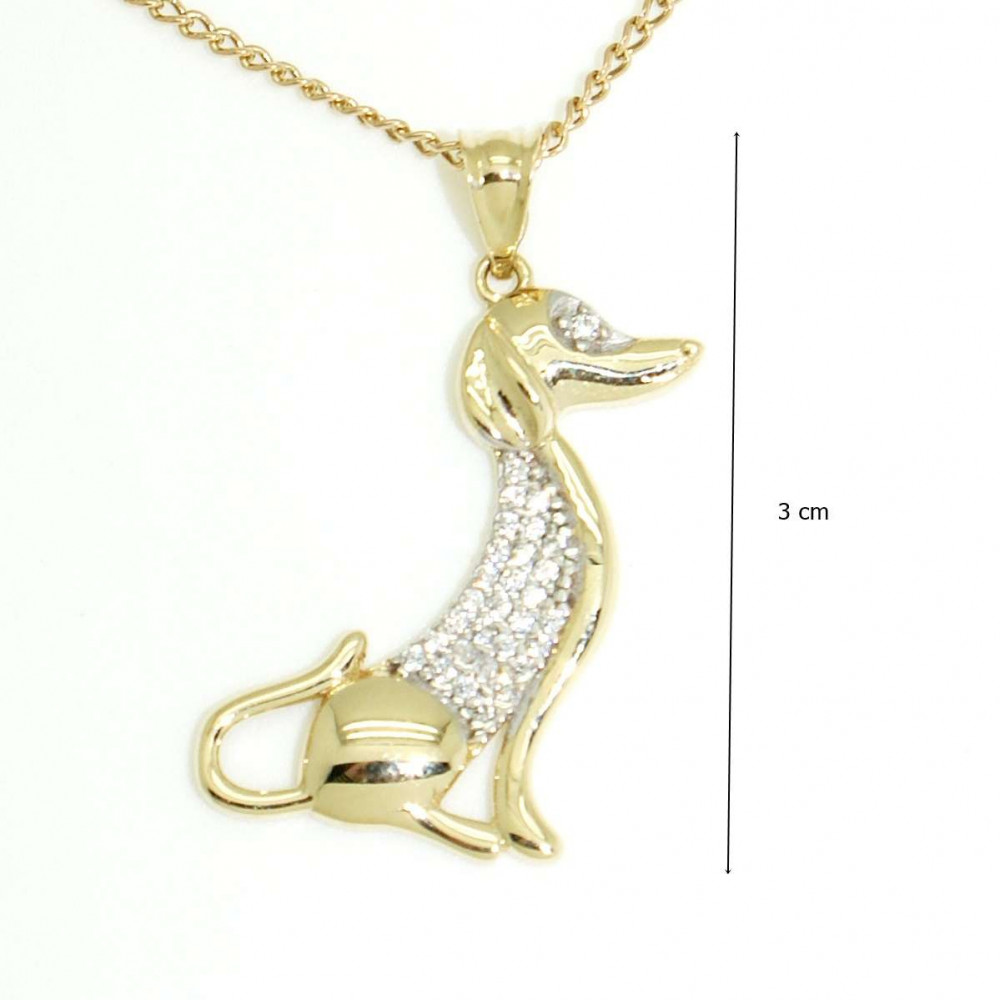 A charming animal pendant in the shape of a sitting dachshund, made of 14-karat gold. The dog's body is decorated with zirconia stones, so this Sitting Dachshund gold pendant can be your shining companion around your neck even when your favorite pet is not with you.