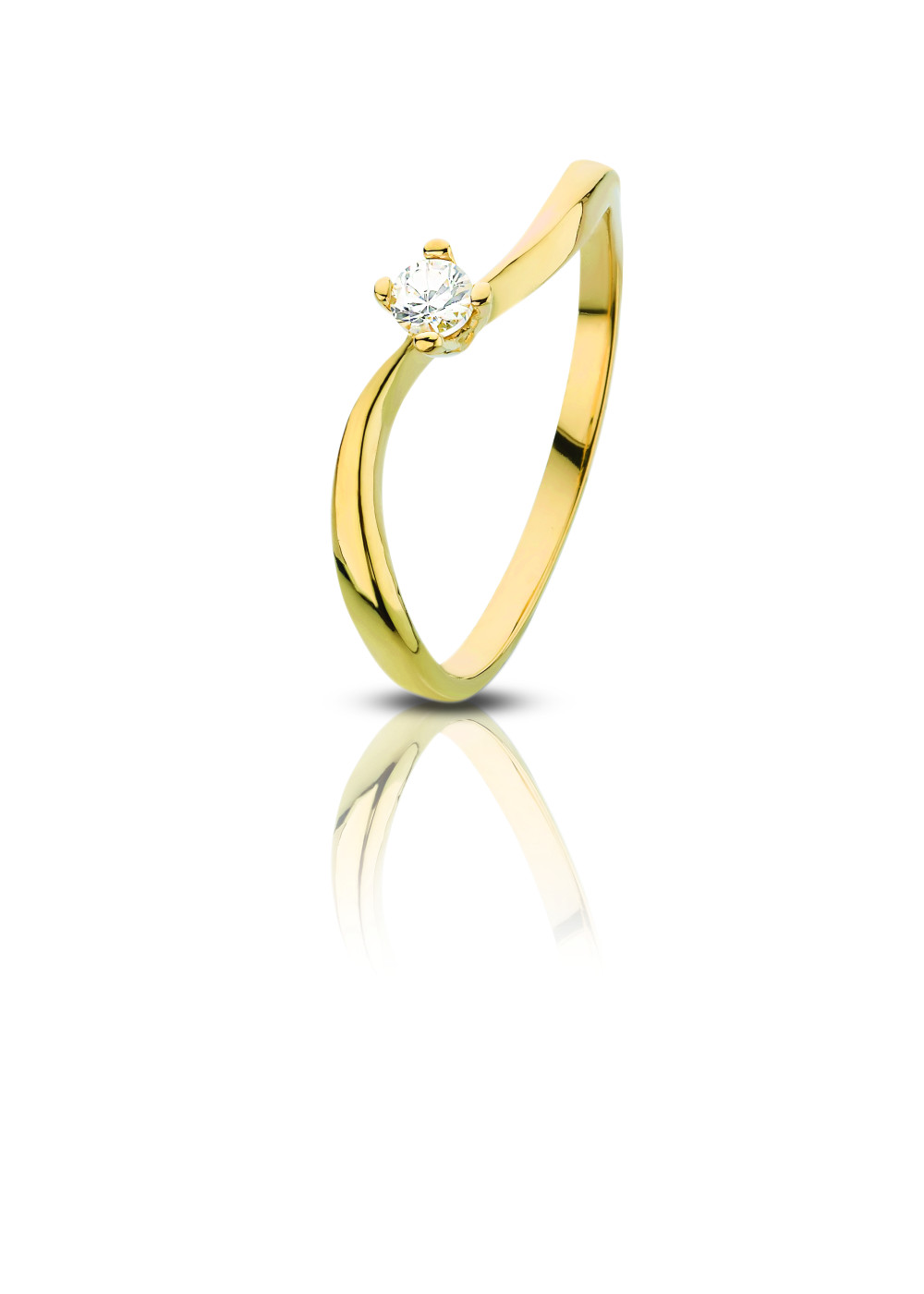 It is as if a gentle breeze had blown softly over this 14-karat gold ring, giving it its final shape. The uniquely shaped ring is adorned with a beautiful zirconia stone. For those with an extraordinary personality, who always stray from the norm, this is the perfect engagement ring or Promise ring.