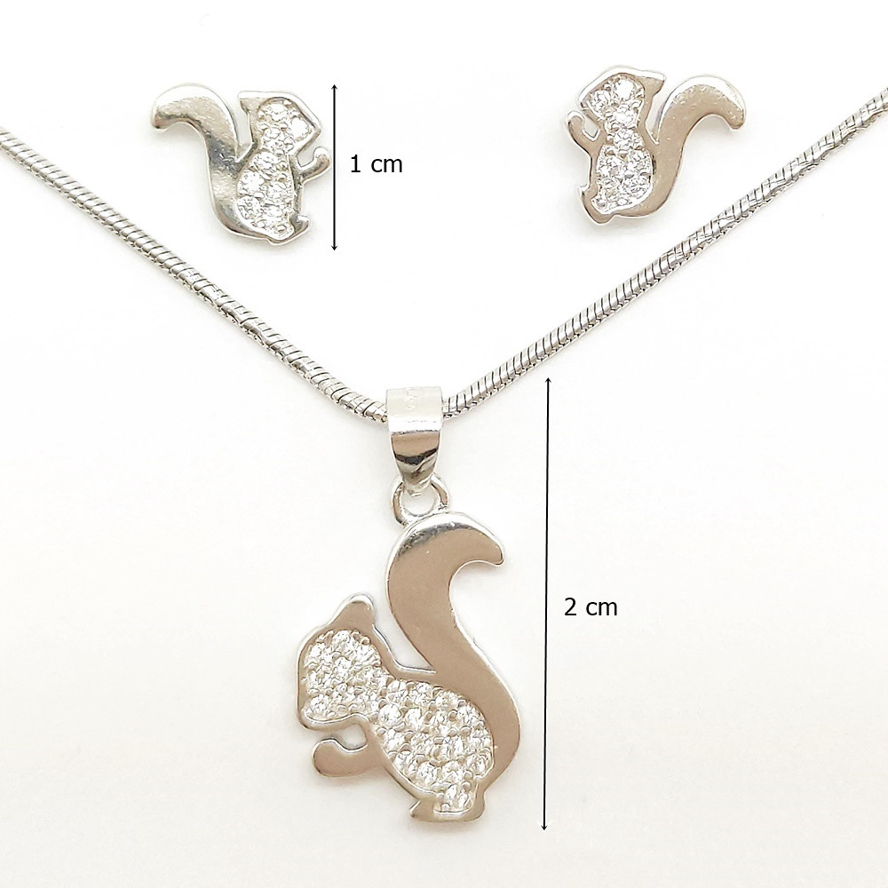 Silver squirrel animal jewelry set decorated with zirconia stones, includes a pair of stud earrings and a charming squirrel pendant. The chain is for illustration only and is not part of the jewelry.