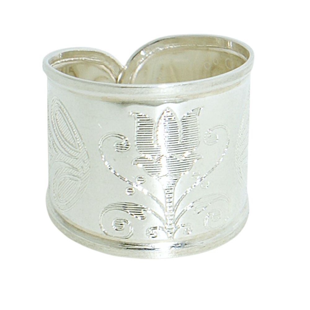 Silver band ring made in Hungary with engraved tulip pattern. The tulip is the embodiment of femininity and was often used in folk art, engraved on gates and chests, but also appeared on clothing and tablecloths. The Turks were the first to cultivate them in large quantities, but today we consider the Netherlands to be the country of tulips.