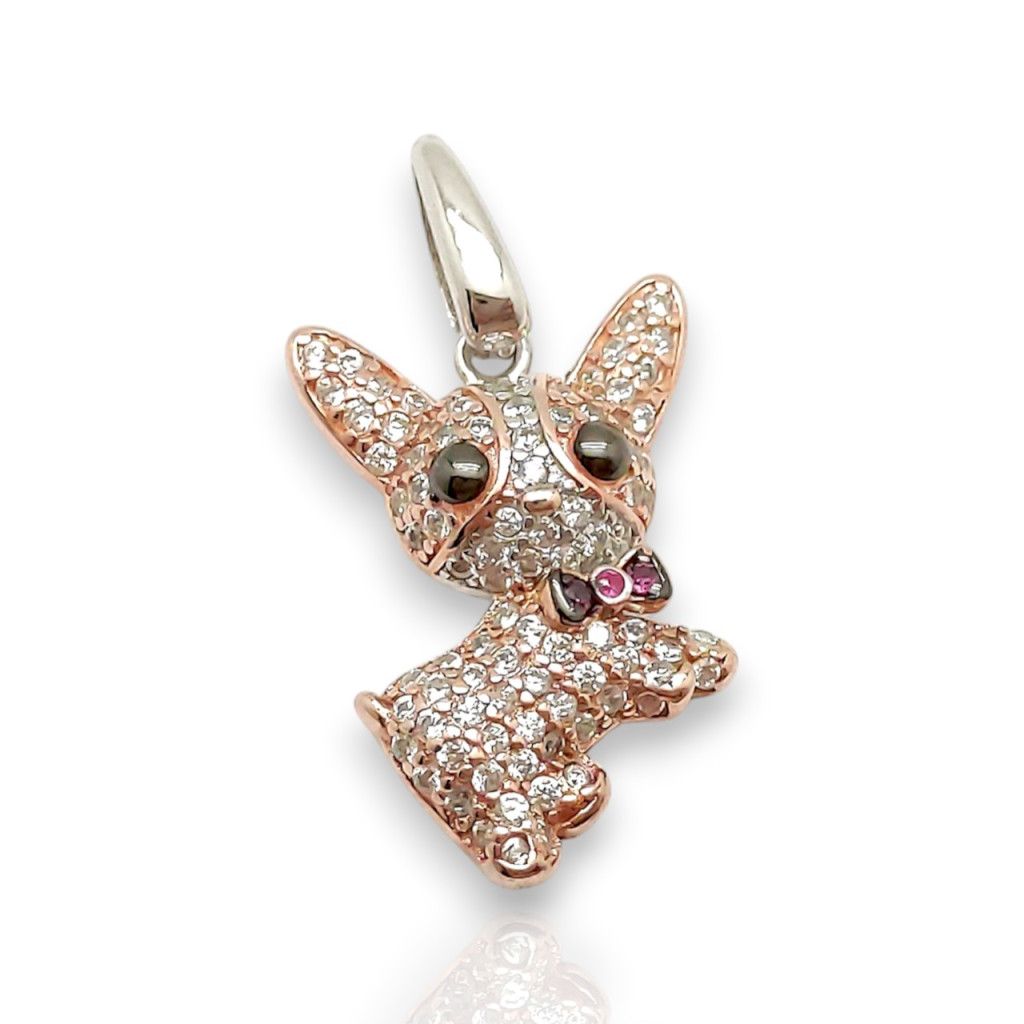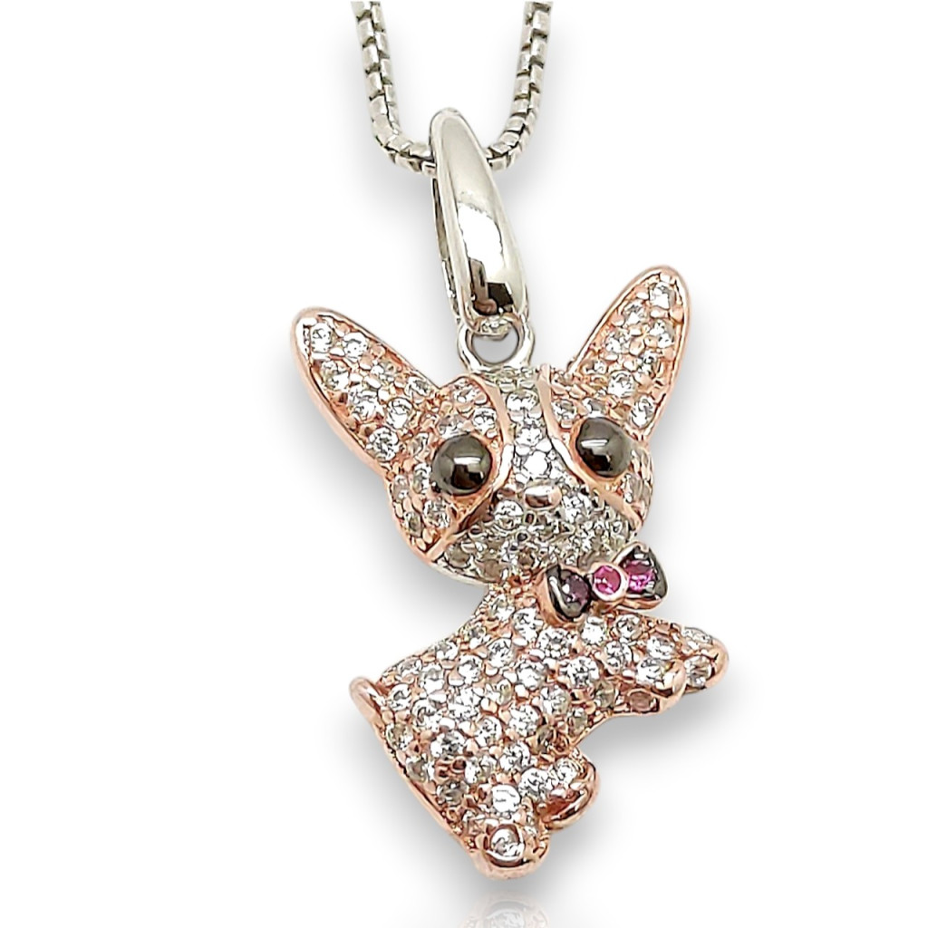 Vigyél egy kis színt és vidámságot a napodba ezzel a Csivava ezüst medállal! Ez az aprólékosan díszített ékszer a világ legkisebb kutyáját ünnepli: a pink kövek bűbájos csavart adnak a megjelenésének, míg a fekete és fehér kövek a részleteket emelik ki. A ródiumozott 925-ös ezüst alap garantálja, hogy az ékszer hosszú ideig megőrizze fényét. Tökéletes választás azoknak a gazdiknak, akik szeretik a látványos, színes és érzelemmel teli állatos kiegészítőket.