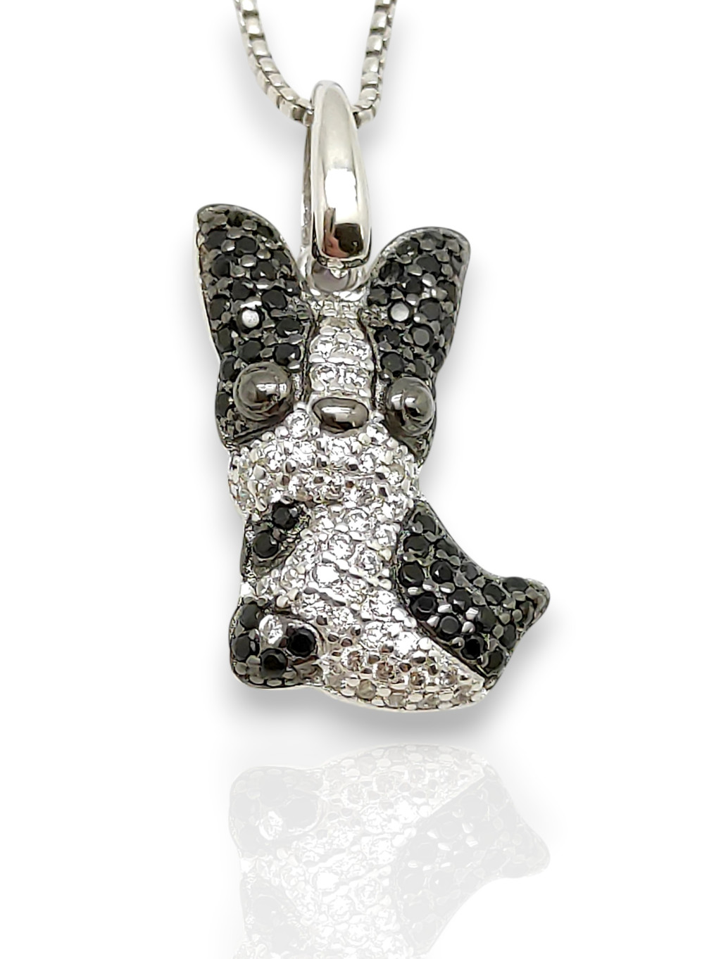 Hordd a szívedhez legközelebb kedvencedet ezzel a különleges Boston terrier ezüst medállal! Az ékszer hűen adja vissza a fajta jellegzetes "szmokingos" megjelenését a fekete és fehér cirkónia kövek kontrasztos játékával. A 925-ös sterling ezüst alap ródiumozott, így tartós és ragyogó marad. Ez a medál nem csupán egy ékszer, hanem egy vallomás a kutyád iránti szeretetedről. Részletgazdag kidolgozása miatt azonnal magára vonzza a tekinteteket, bármilyen vékonyabb ezüst láncon viselve.